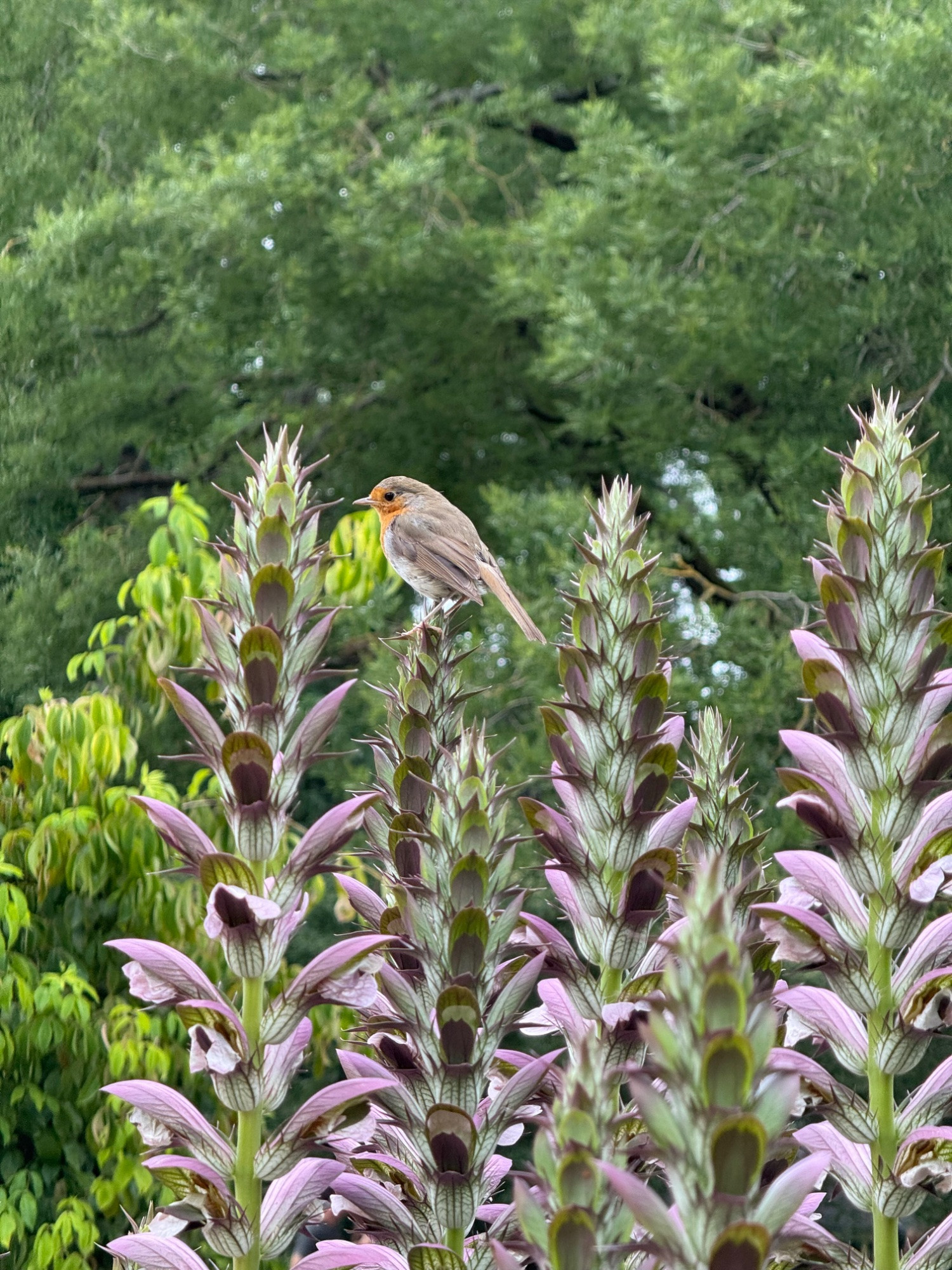 Auf dem stacheligen Akanthus scheint sich das Rotkehlchen sehr sicher zu fühlen