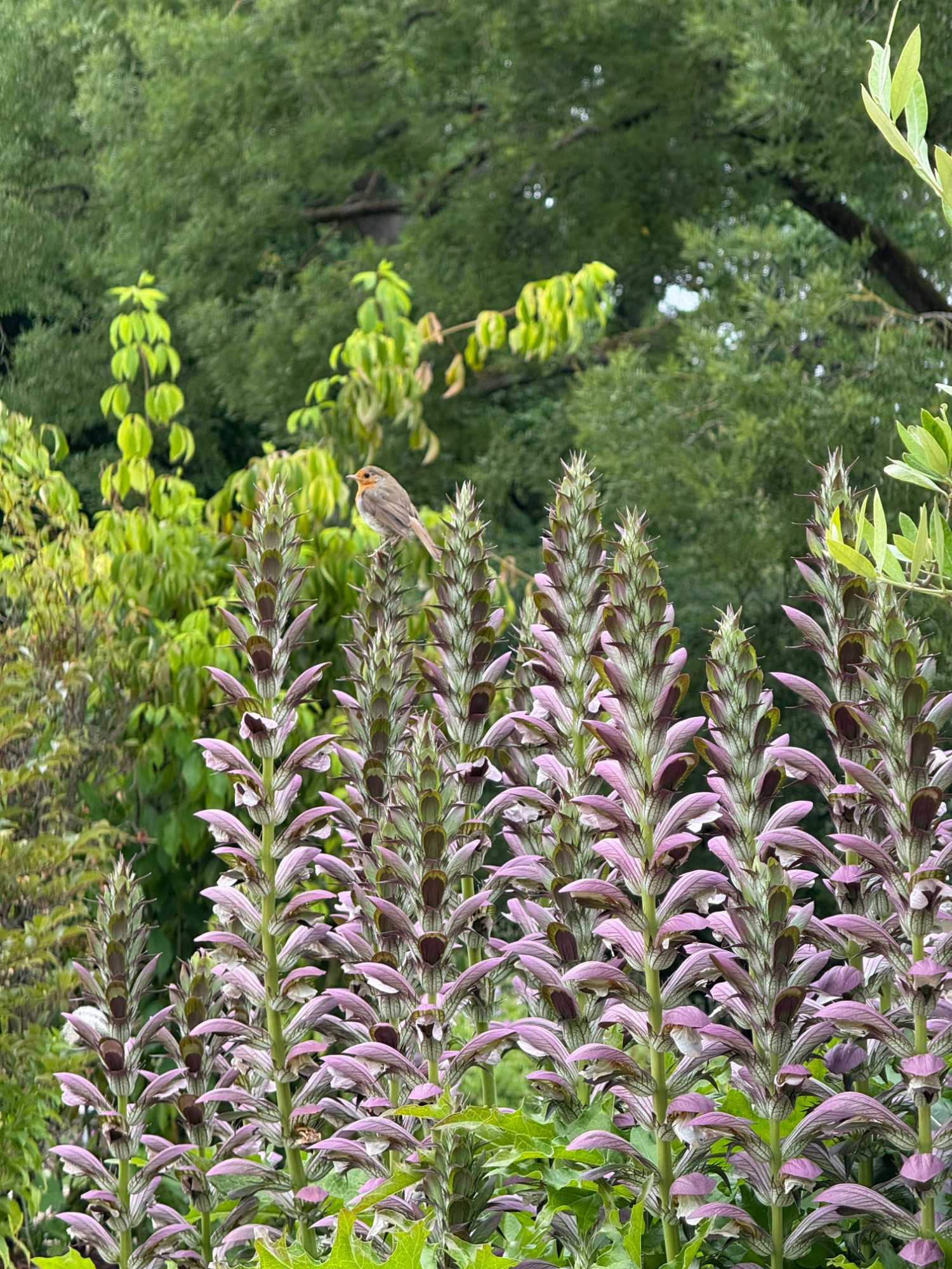 Auf dem stacheligen Akanthus scheint sich das Rotkehlchen sehr sicher zu fühlen