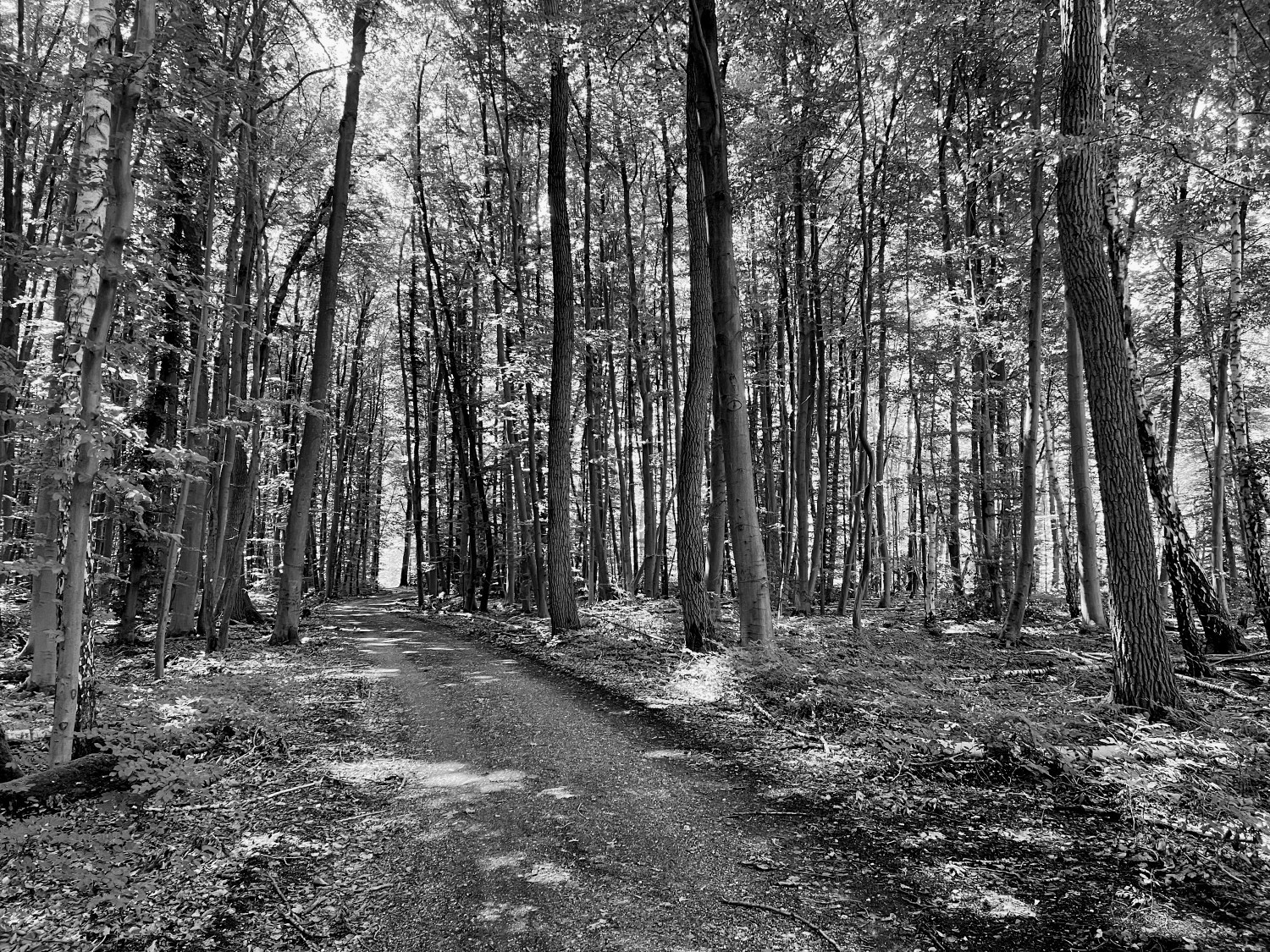 Juli, Hochsommer beginnt. Auf den Feldern beginnt die Ernte. Dürre mangels Niederschlägen, zumindest hier, die Wolken tun nur so. Dagegen im Wald noch Blattwerk, flirrendes Licht, Kühle. In s/w m.E. pointierter als in Farbe.