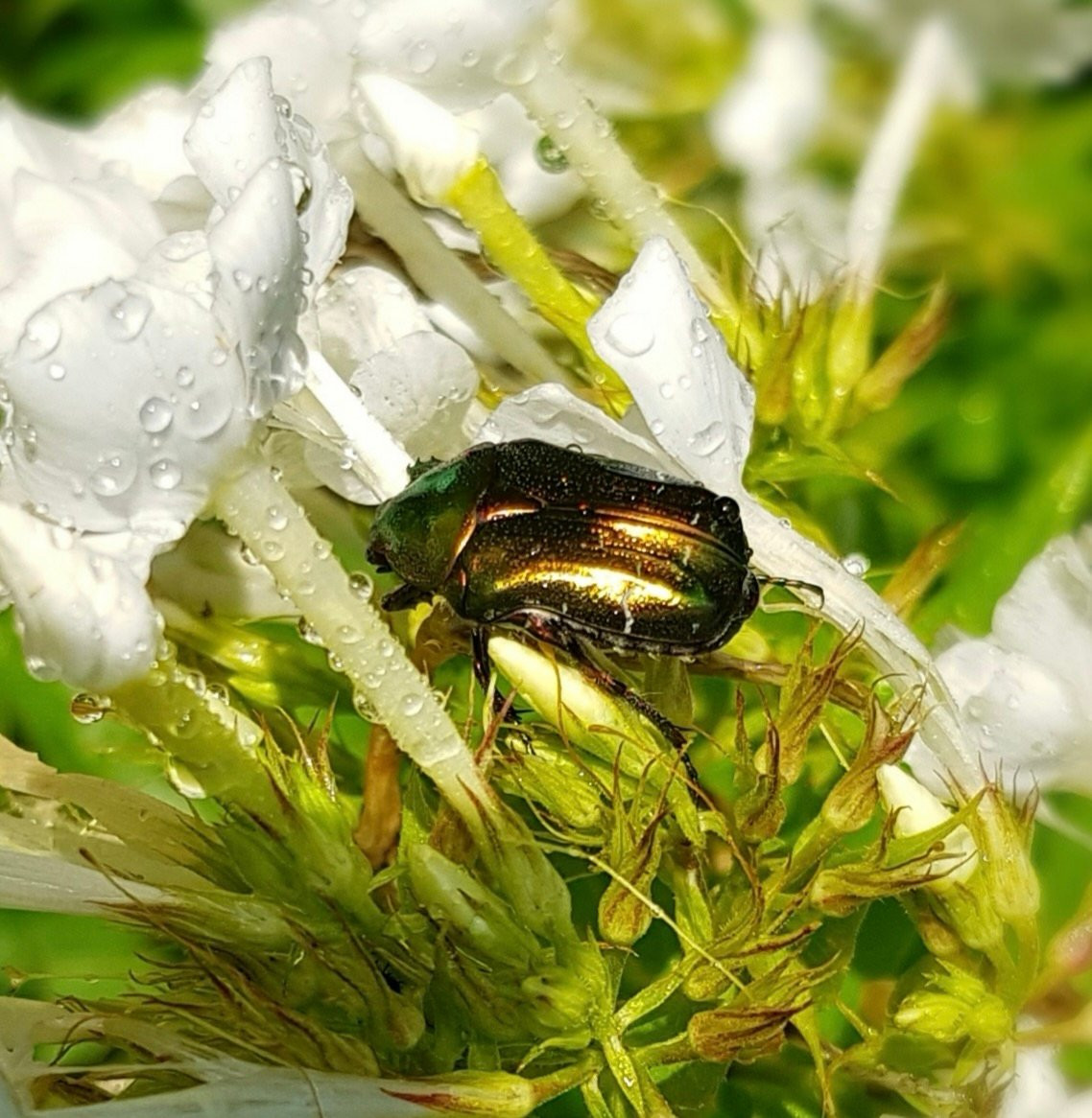 Gestern nach dem Gewitter mit ergiebigem Regen fand ich auf dem niedergedrückten Phlox zwei Käfer von gleichem Wuchs aber unterschiedlicher Färbung, der eine braun, der andere grün. Kann mir jemand den Namen verraten?