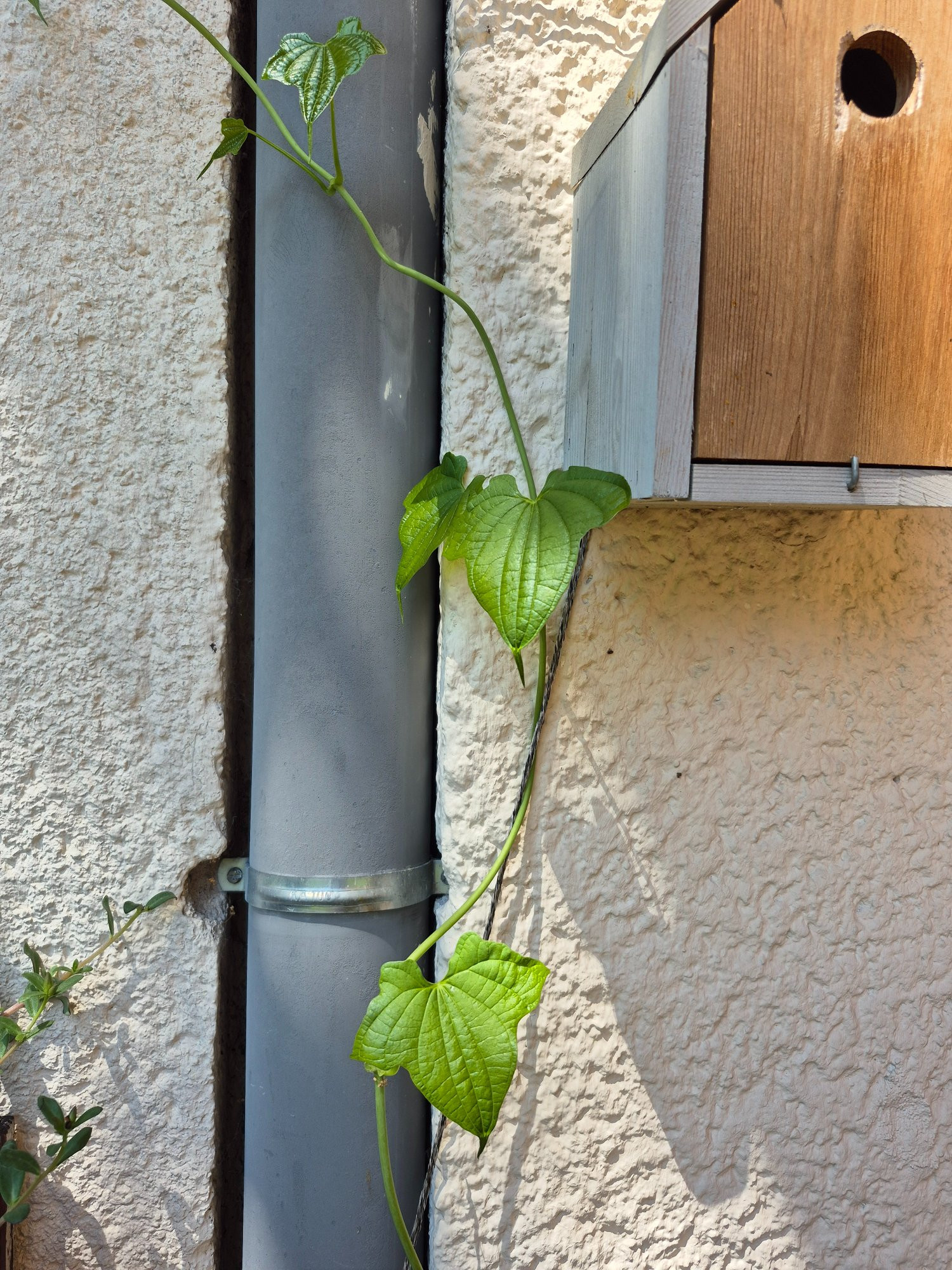 Dioscorea sansibarensis war bisher eher handzahm hier. Dieses Jahr macht sie aber richtig Meter. Kleine Knollen treiben normalerweise eher spät im Jahr aus, bilden aber trotzdem zuverlässig Luftknollen aus.