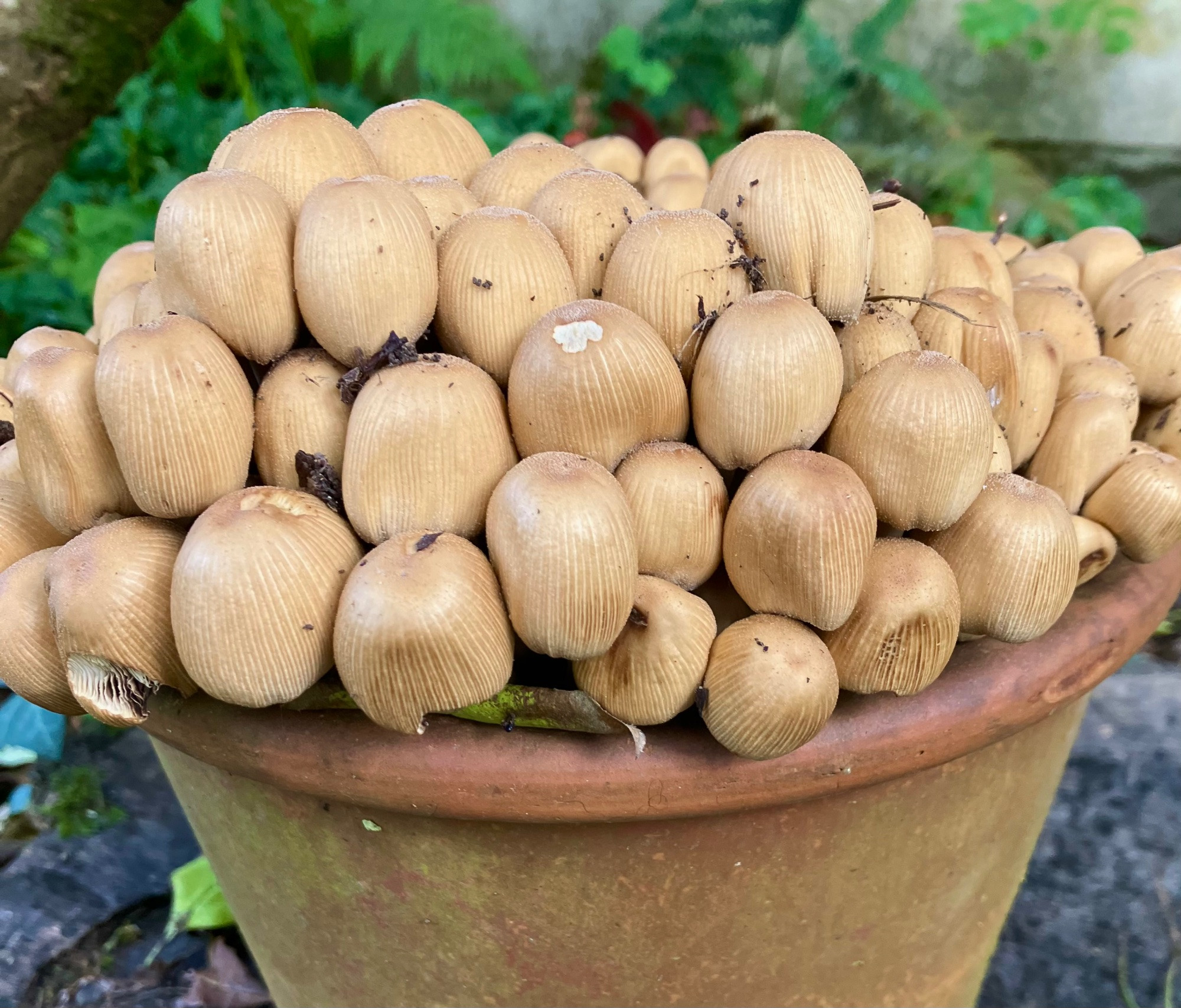 Häufig ist in Substrat der gelbe Pilz Leucocoprinus birnbaumii (Gelber Faltenschirmling, auch Blumentopfpilz genannt). Den sieht man nie irgendwo in der Natur, er ist bei uns auch gar nicht heimisch und überlebensfähig, aber offensichtlich wird er durch den internationalen Handel mit Pflanzen für kurze Zeit eingeschleppt, bevor das Pilzmyzel (Pilzgeflecht) zu kühl und zu trocken stirbt.