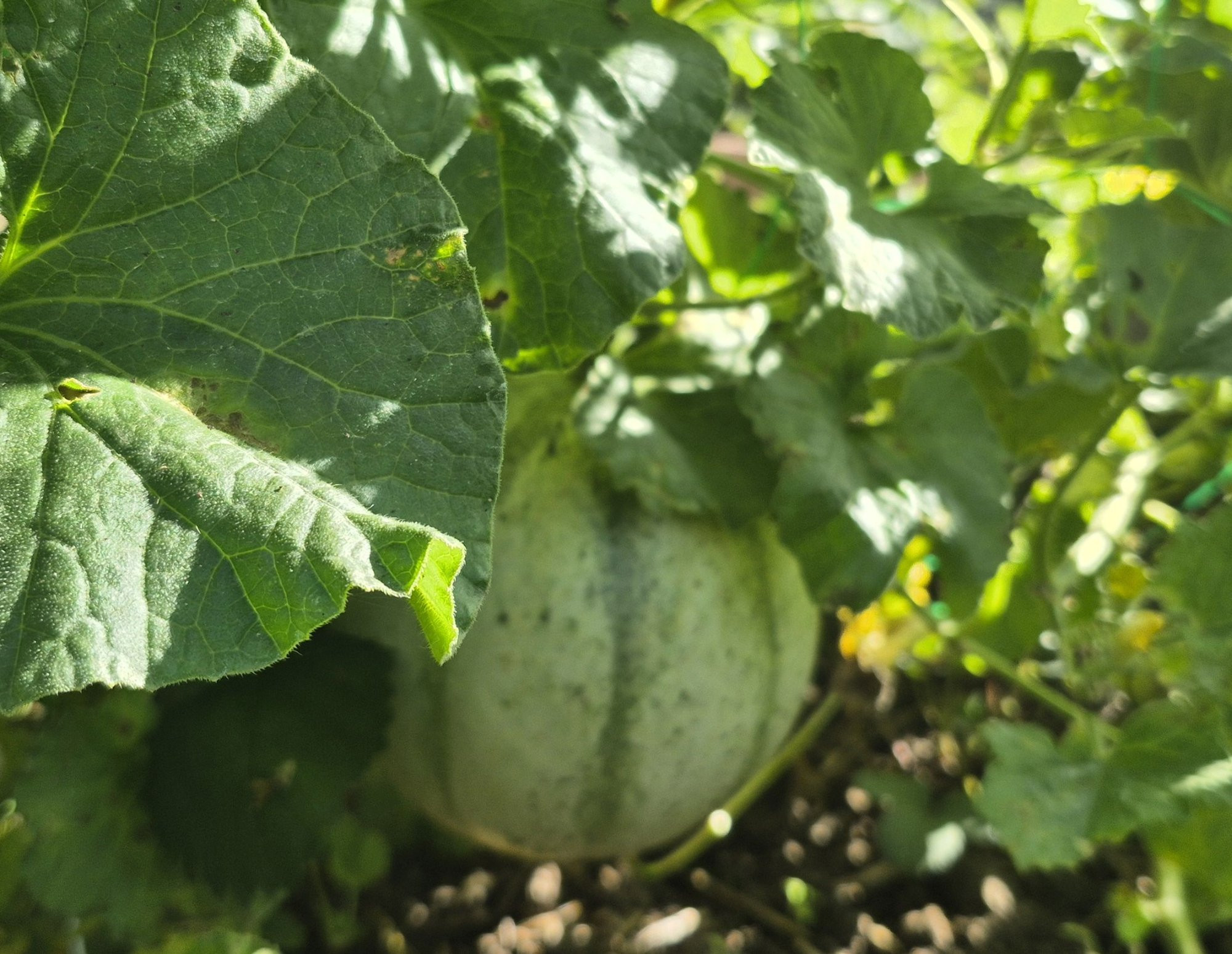 Obwohl auch empfindliche Sorten drin sind, hier liegen fünf unreife Charentaismelonen: