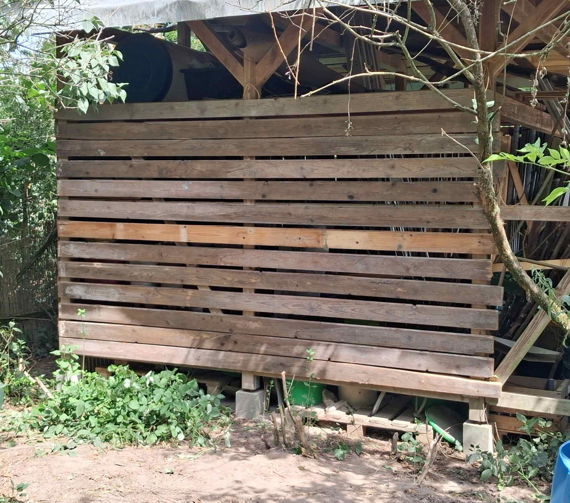 Dort hatte ich letzten Herbst so gerodet (roden lassen) dass man vom Weg direkt in den Schuppen gucken konnte. Es mussten also Wände her. Interims hatte ich mit Bändchengewebe zugehängt. Da kommen die Bretter natürlich zu Pass.