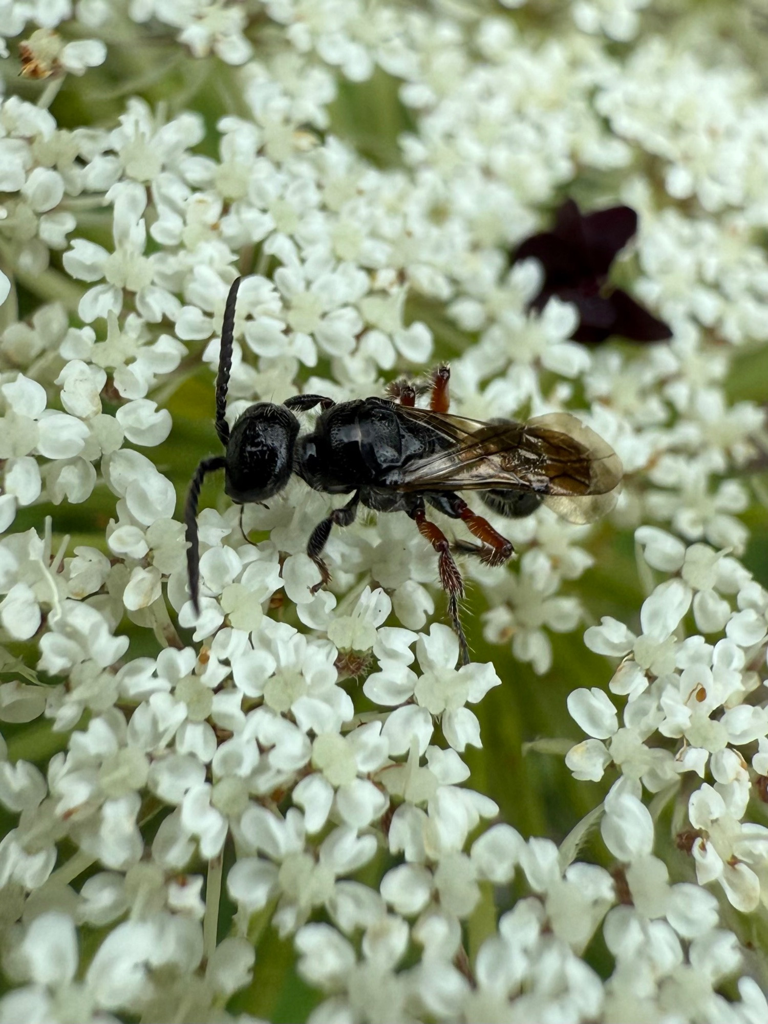 Die Gemeine Rollwespe (Tiphia femorata) ist ein Parasitoid, dessen Weibchen im Boden aktiv nach lebenden Larven (Engerlinge) von Blatthornkäfern suchen. Ihr Hauptwirt ist dabei der Junikäfer (Amphimallon solstitiale). Hat sie einen Wirt aufgespürt, lähmt sie ihn mit einem gezielten Stich, legt ein einzelnes Ei an seinem Körper ab und überlässt die Käferlarve ihrem Schicksal. Die schlüpfende Wespenlarve frisst den Engerling von außen langsam auf, während man die erwachsenen Wespen im Hochsommer harmlos Nektar auf Doldenblütlern schlürfen sieht. Als natürlicher Gegenspieler des Junikäfers ist sie somit ein wichtiger Nützling im Ökosystem. In dem Beet mit der Daucus waren auch in der Tat im Juni einige Juni-Käfer. Femorata bezieht sich auf die rotbraune Färbung der Hinterbeine anhand man die Art gut bestimmen kann: Der deutsche Name der Gattung der Rollwespen (Tiphia) stammt vom spiralförmigen Einrollen der Fühler nach dem Tod des Weibchens.