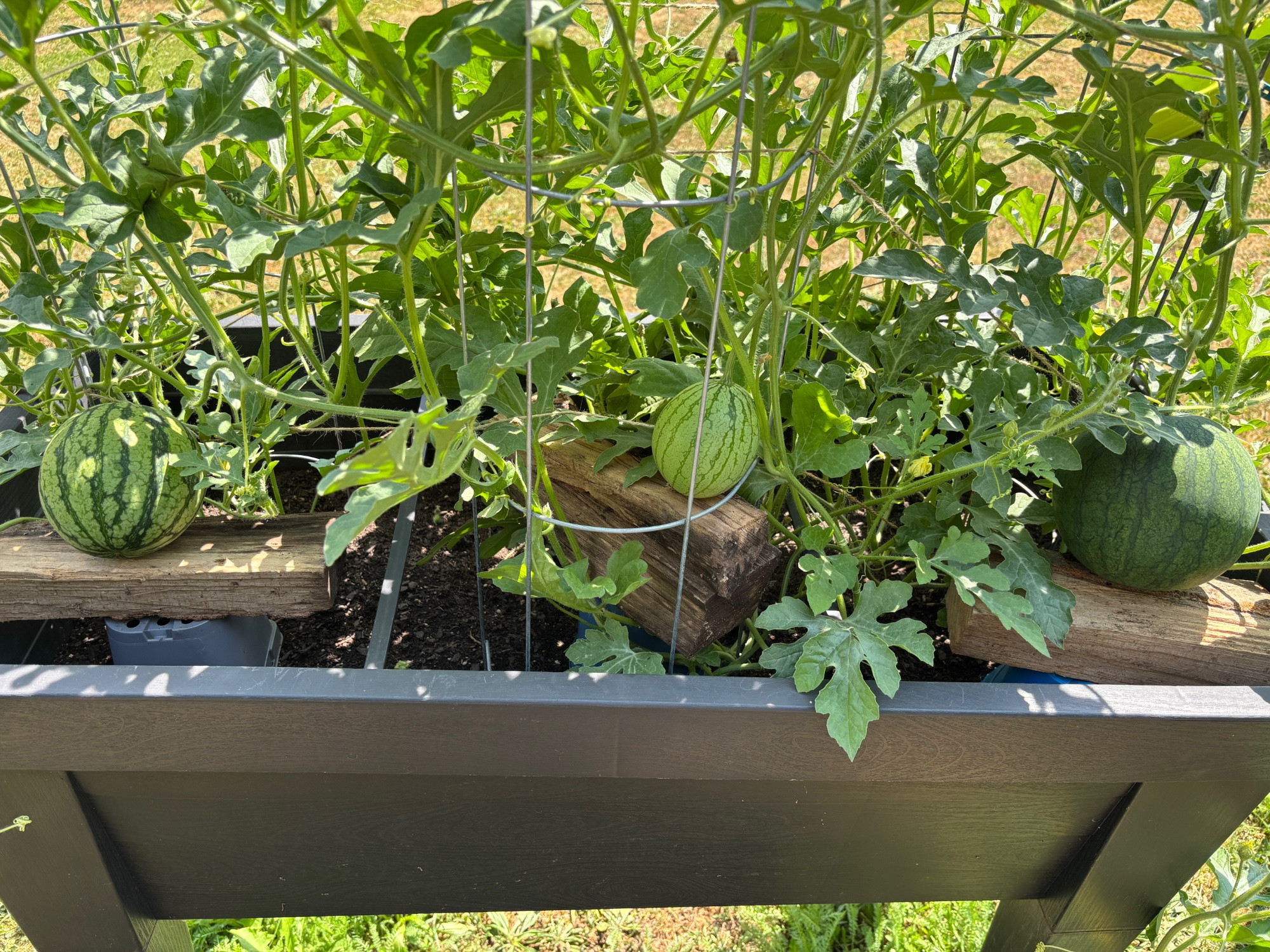 Mein Wassermelonen im Hochbeet machen sich gut. Es hängen drei Wassermelonen.