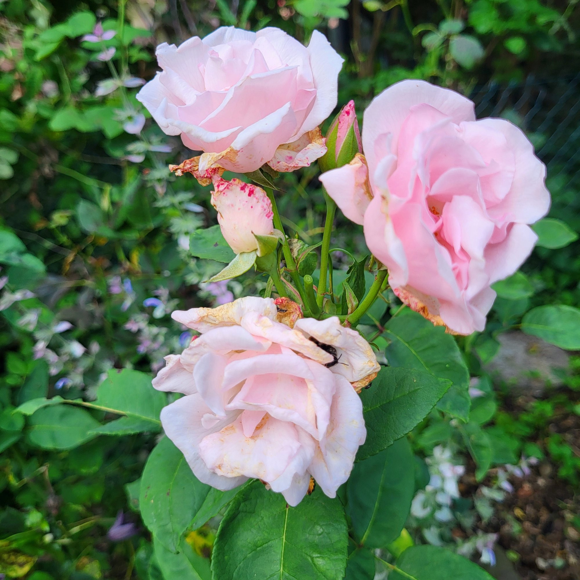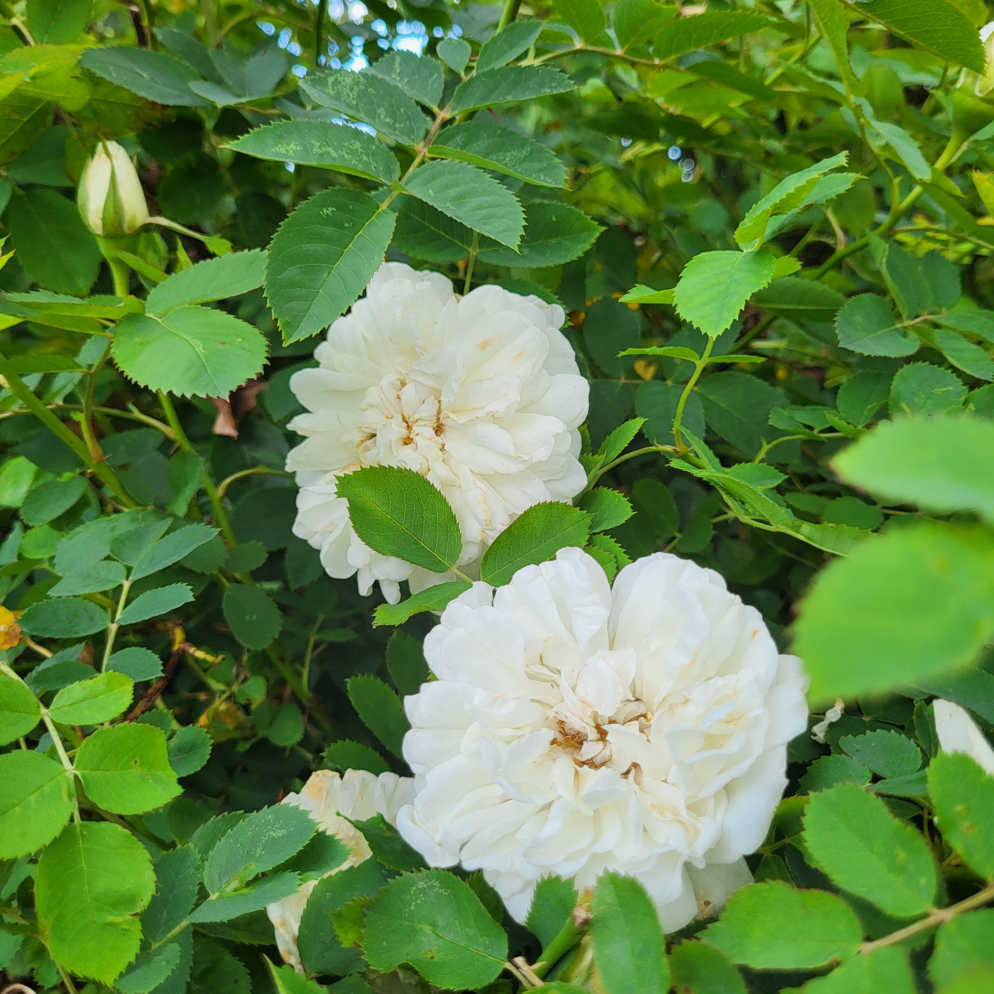 Bevor der große Regen gekommen ist , habe ich Souvenir de la Malmaison und ihren Sport Souv . de St. Anne's noch bei der ersten Nachblüte erwischt. Üppige Sträucher sind die beiden hier leider nicht.