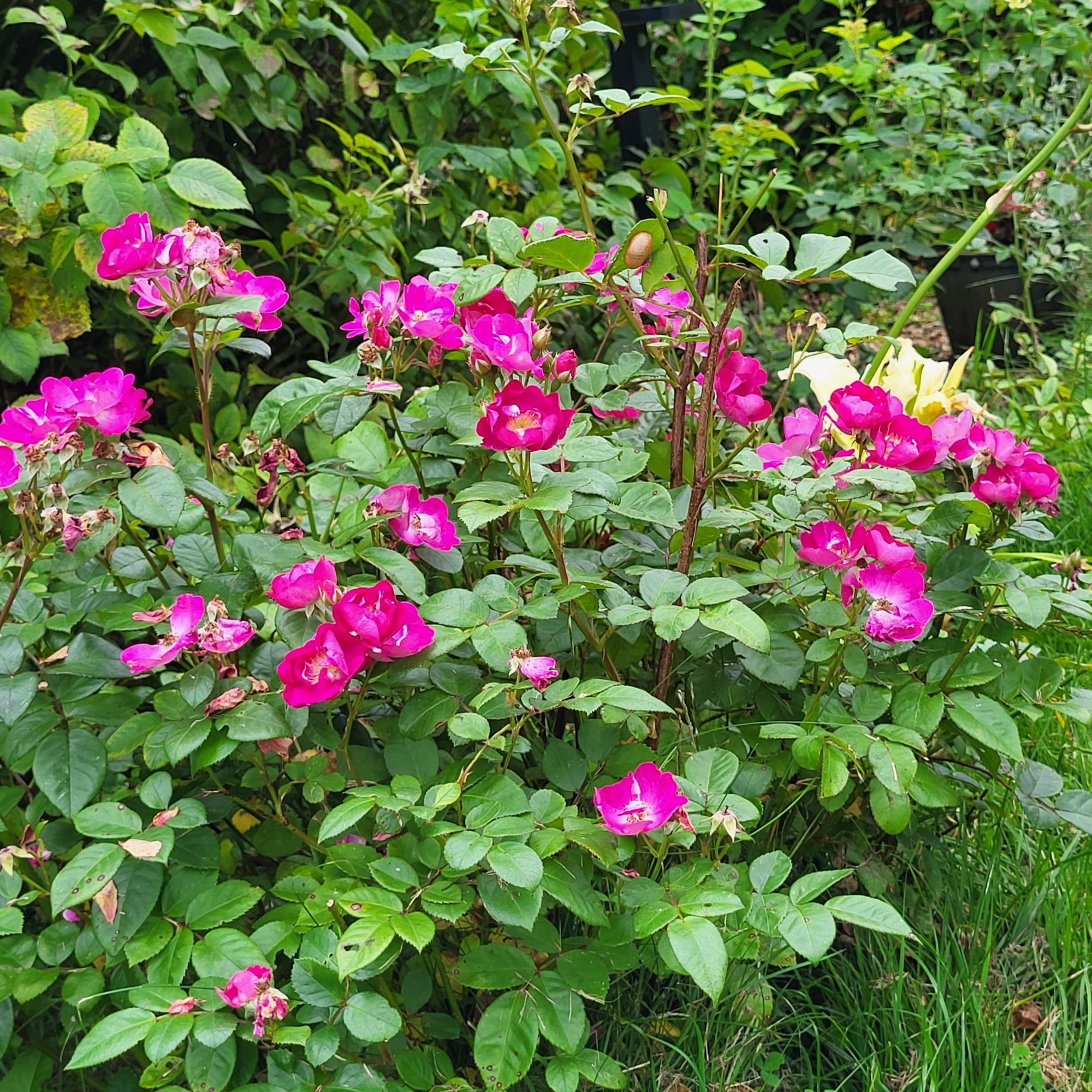 Caecilie Scharsach, RH von Geschwind, habe ich im letzten Frühherbst ausgepfanzt. Sie stand ein halbes Jahr getopft und machte einen sehr guten Eindruck. Dass das Reh sie verbissen hat, kann ich ihr nicht anlasten. Es ist also die Erstblüte. Der Strauch wirkt harmonisch, die Rose ist gut duftend und sehr gesund.