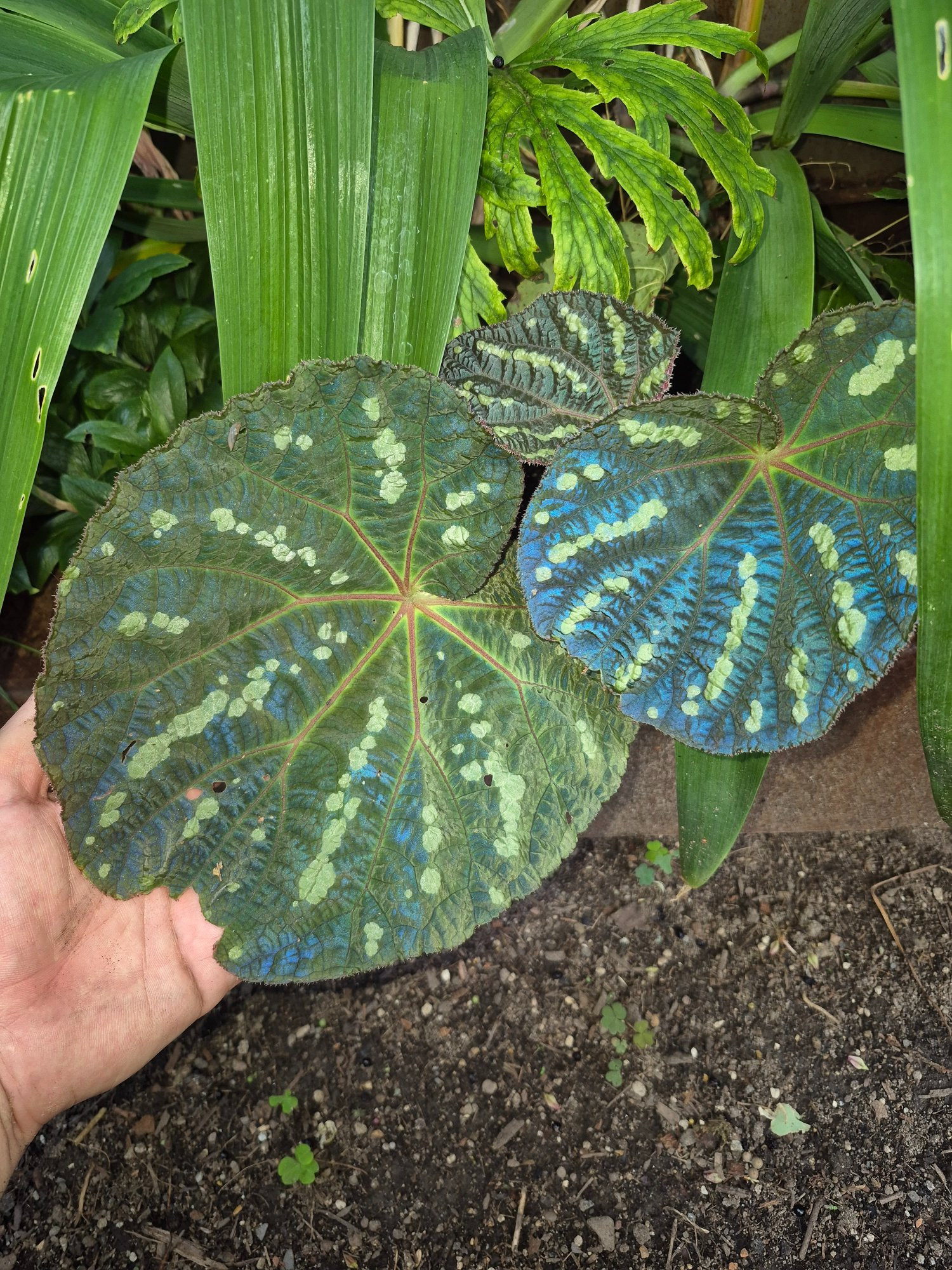 Begonia xanthina. Habe sie bereits seit Jahren im Topf und vergesse sie regelmäßig in der dunkelsten Ecke, nur um sie dann so vorzufinden. In der Dämmerung und mit Taschenlampe irisieren die Blätter leuchtend blau. Verträgt mindestens leichten Frost - mehr bisher nicht getestet.