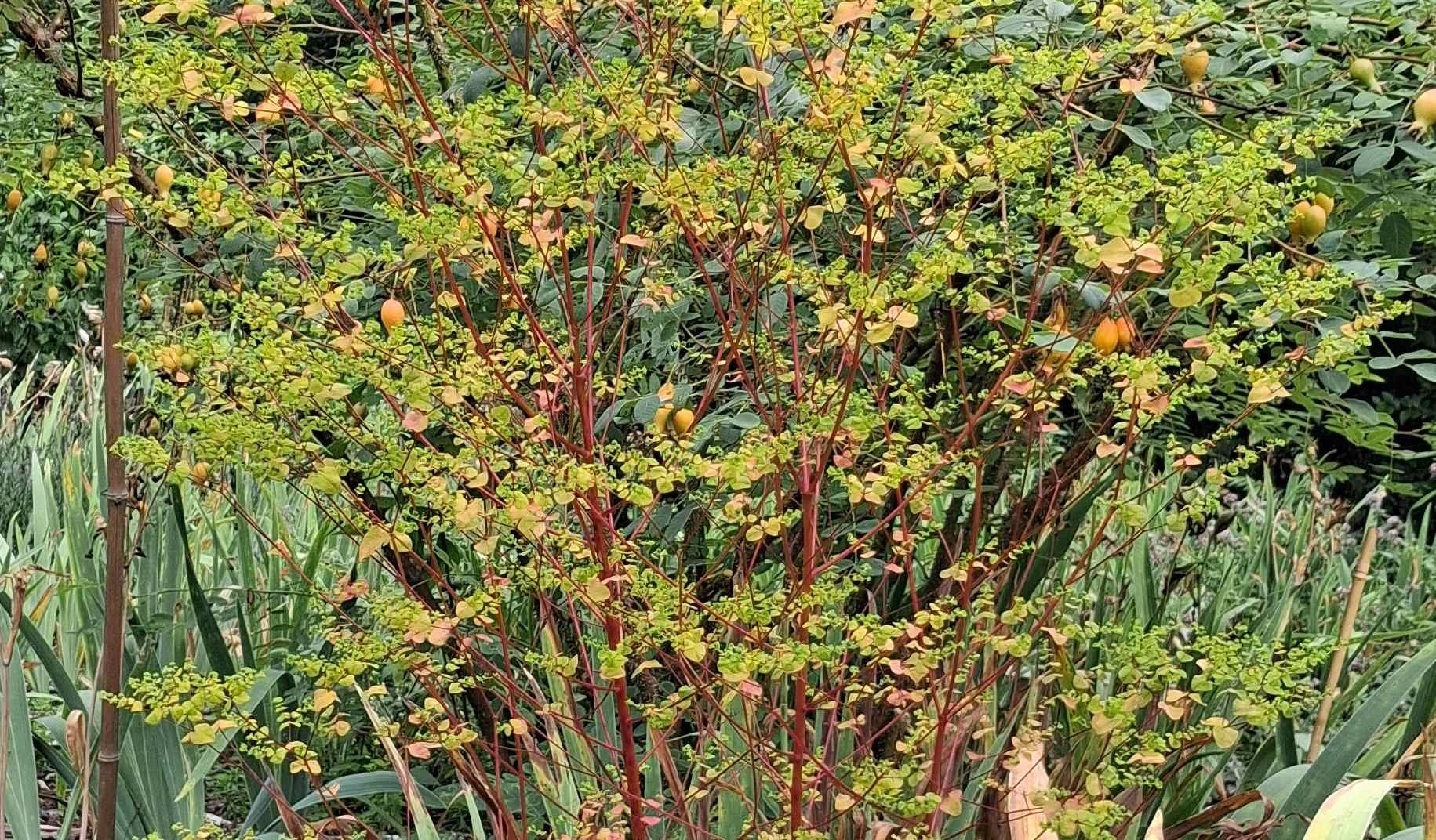 Meine geliebte Euphorbia stricta überspielt gerade schön die vergehenden Irisblätter.