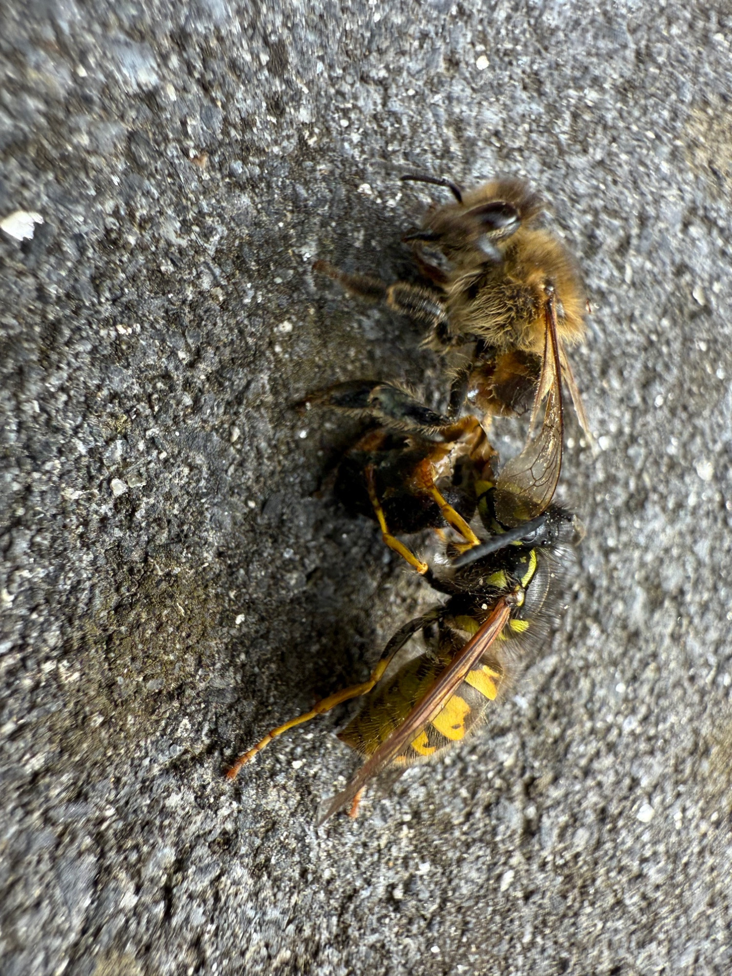 Gestern beobachtete ich, wie Wespen gezielt und in größerer Zahl Honigbienen töteten. Dieses massenhafte Jagdverhalten war mir bisher primär von Hornissen bekannt.