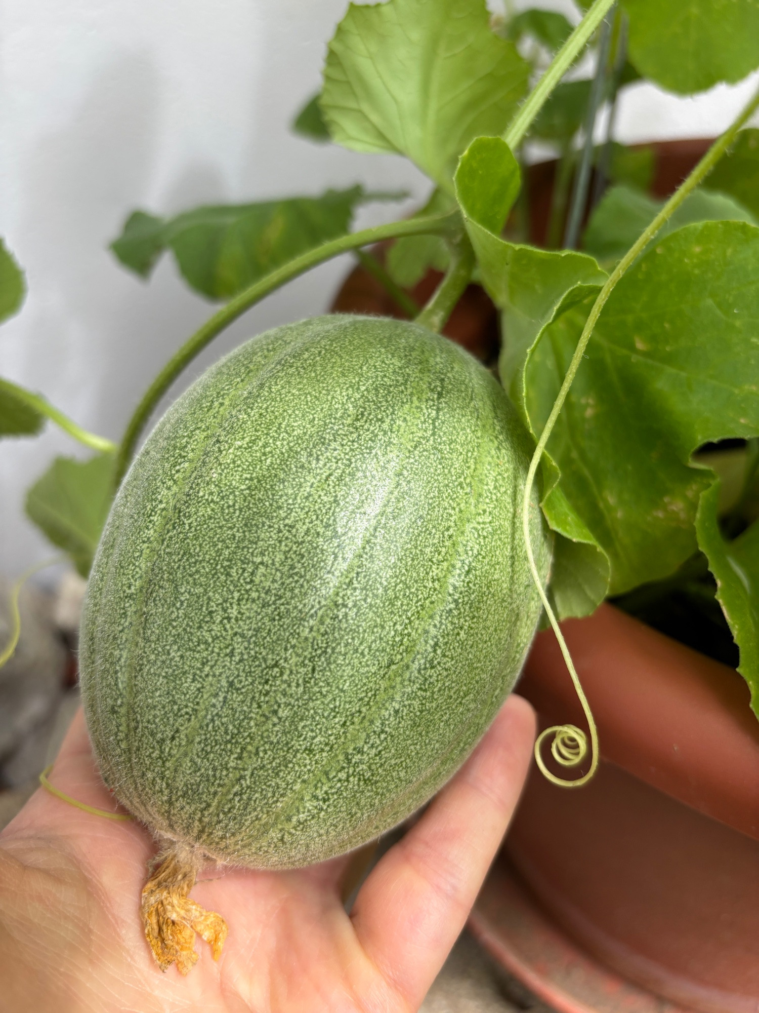 Dieses Jahr wird es wohl nichts mehr mit brauchbaren Melonen. Gestern habe ich dieses fleckige Exemplar geerntet. Im Inneren war es aber ok, evtl. sogar fast überreif, also stellenweise etwas weich. Geruch und Geschmach waren aber in Ordnung.