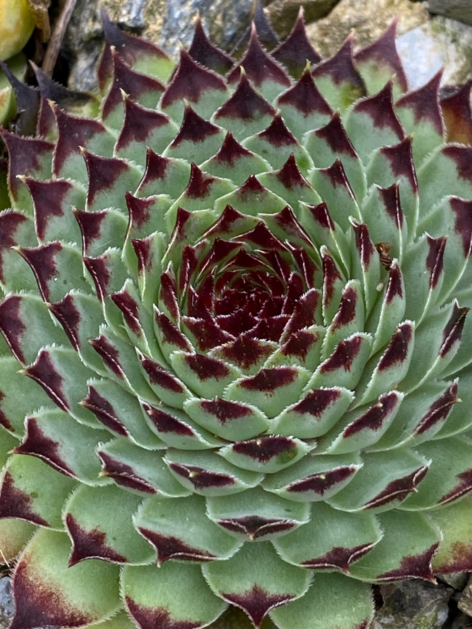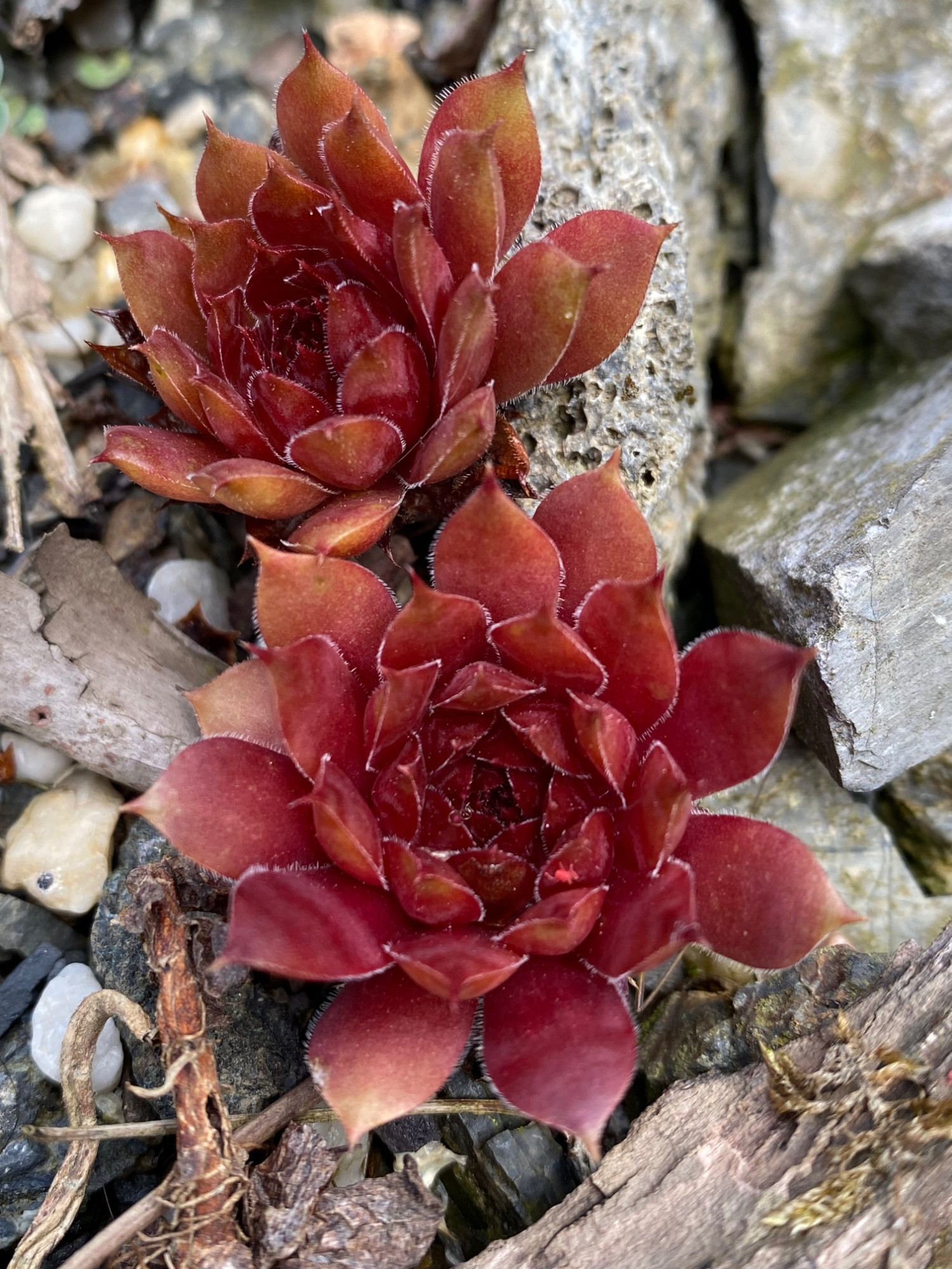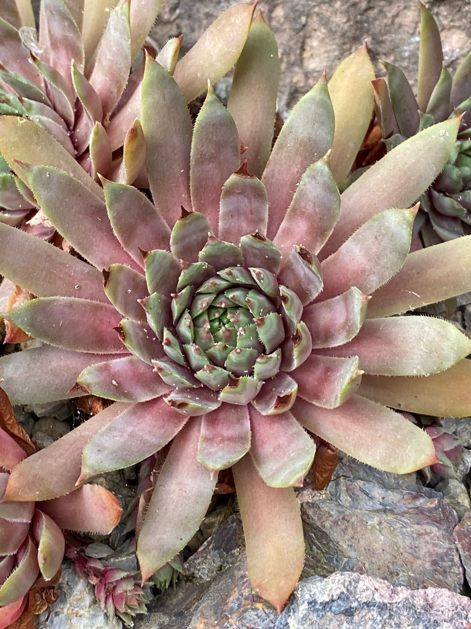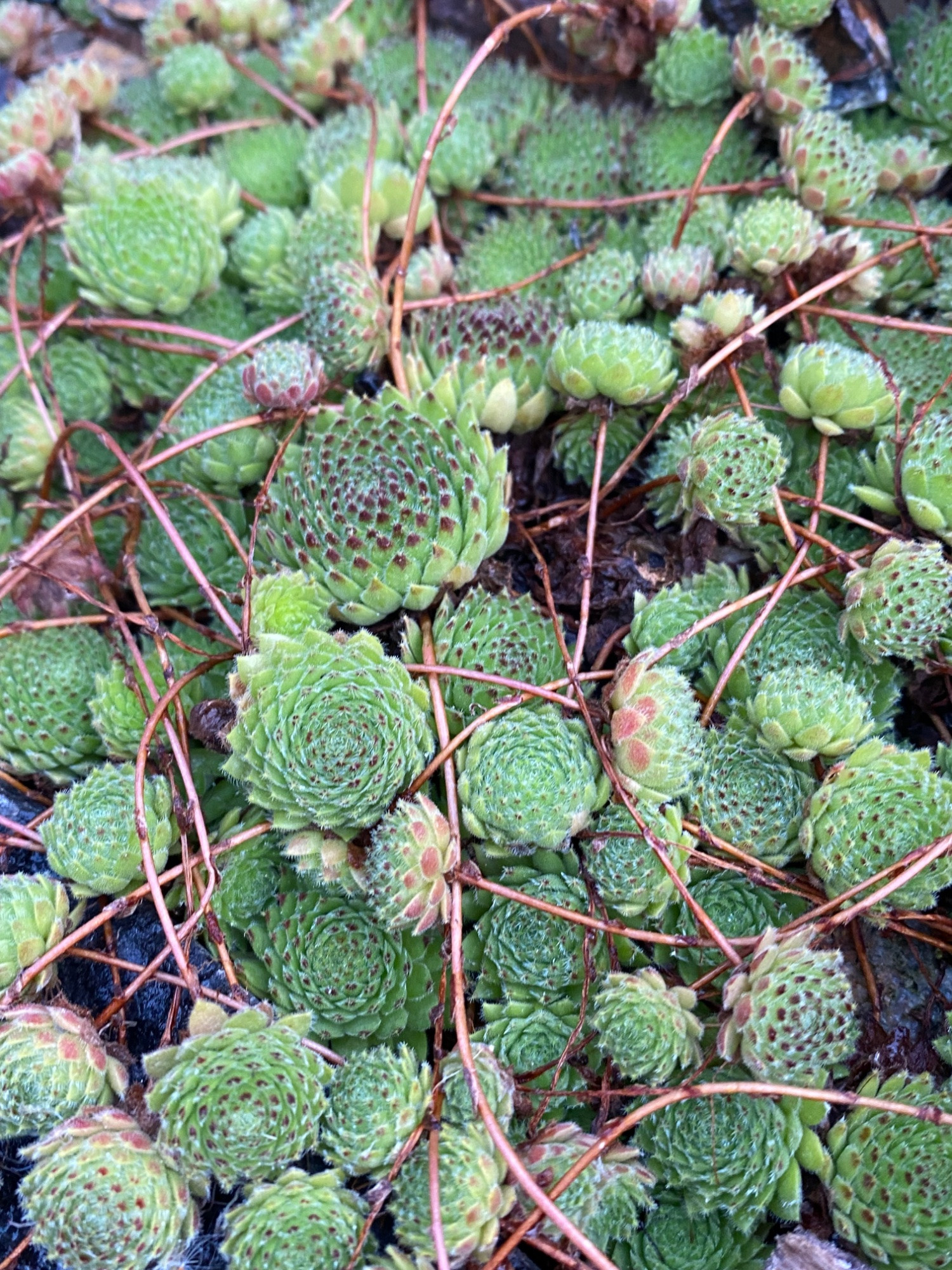 Heute habe ich versucht, sie mit einer Pflanzen-Erkennungs-App zu identifizieren, und dabei zwei unterschiedliche Ergebnisse bekommen: Sempervivum tectorum und Sempervivum calcareum.