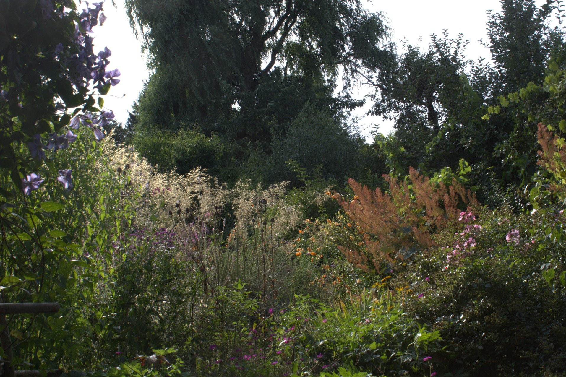 Blick vom Gartentor auf Federmohn, Lilium henryi, außerdem Stipa, Monarda