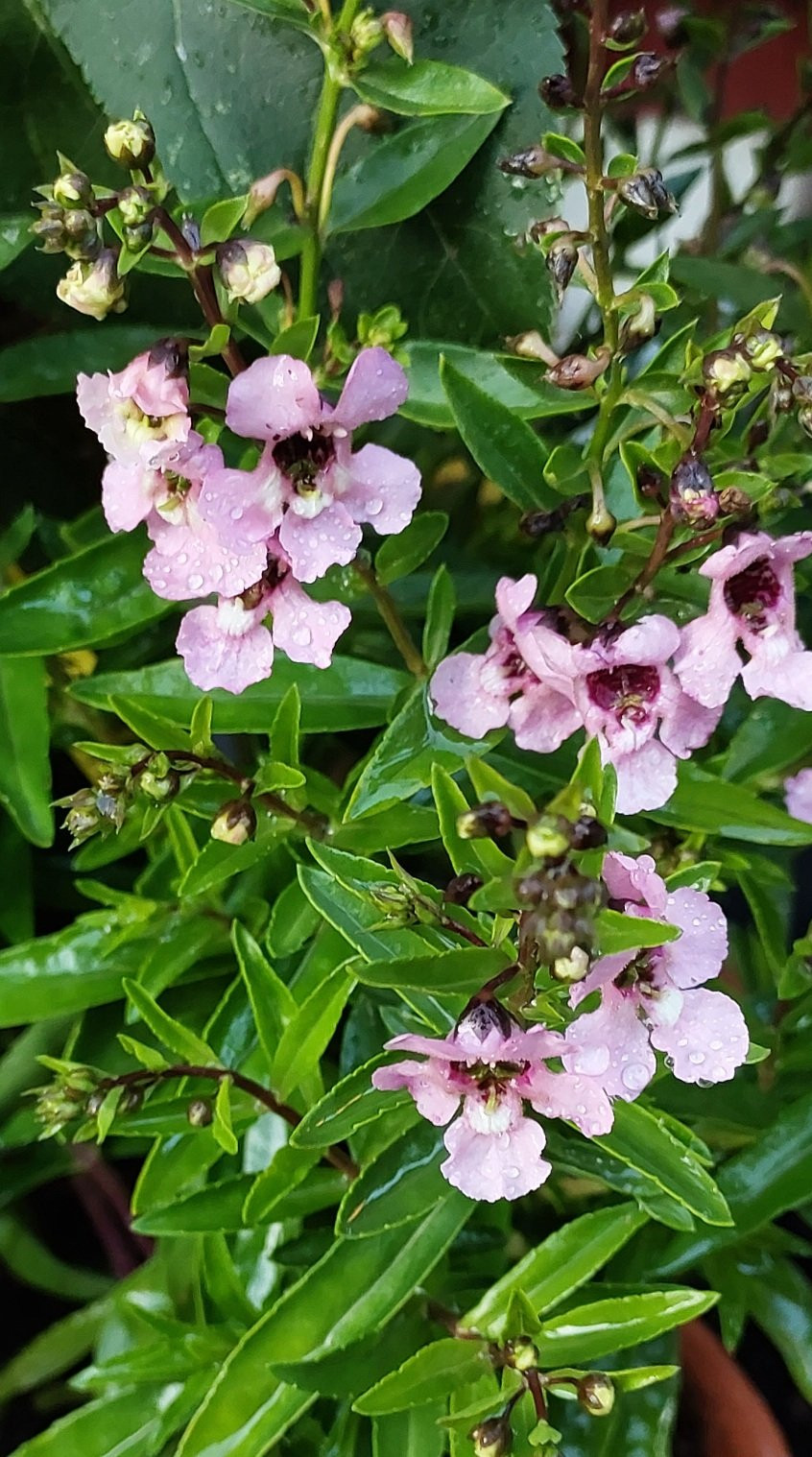 Angelonia, Caryopteris und in einem Topf Pelargonien hat sich ein Hornveilchen eingenistet.