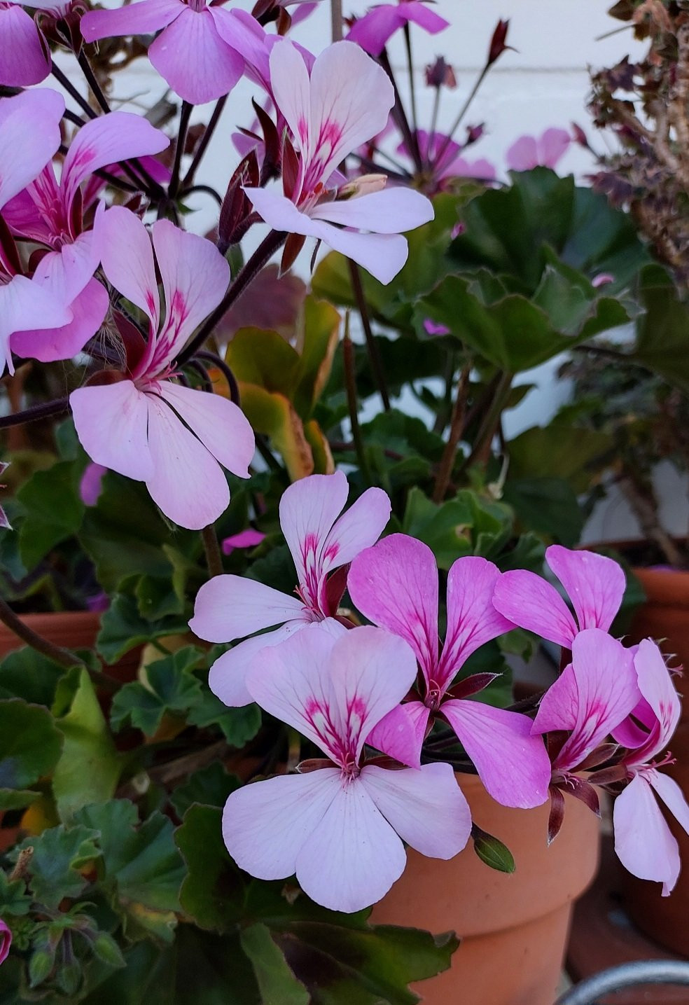 2 aparte Pelargonien und der weisse Staudenclematis hat eine Nachblüte.