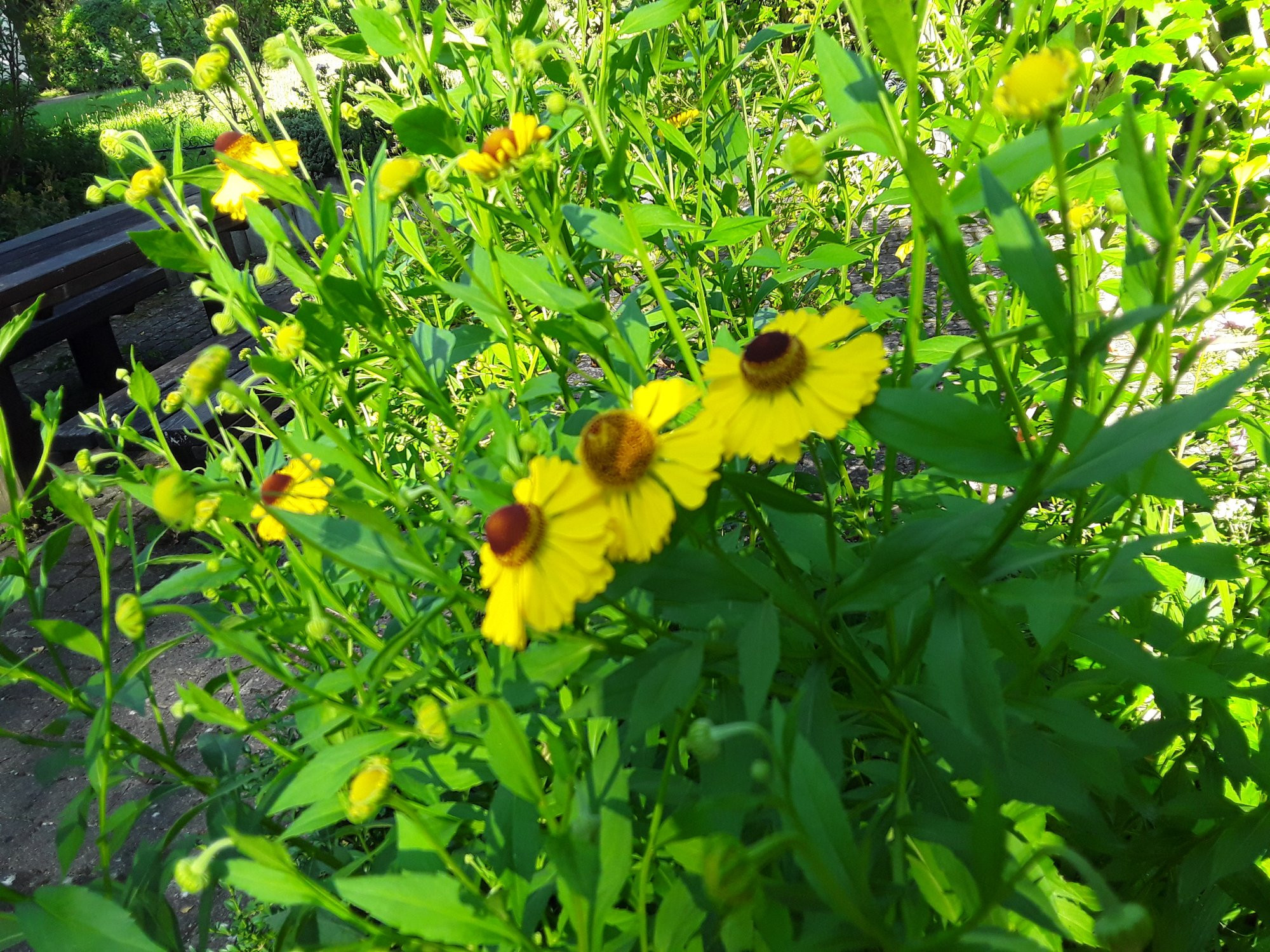 Weisse und rote Erdbeerblüte. Echinacea in den letzten Zügen.