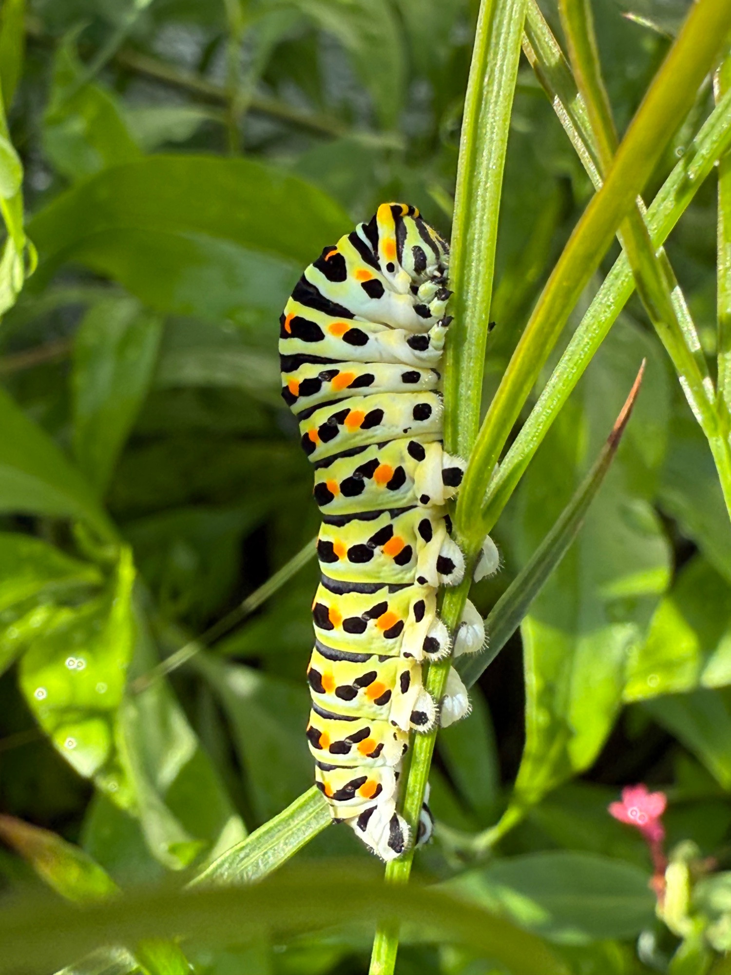 Aber der Blattschopf ist dennoch schön grün und zierend, was man nicht von allen Doldenblütlern nach der Blüte behaupten kann und das ich jetzt schon an mehrere Schwalbenschwänze dran gesehen habe werte ich auch als großes Plus: Langsam wird die Raupe recht gefräßig mal schauen wie viel vom Peucedanum übrig bleibt ..