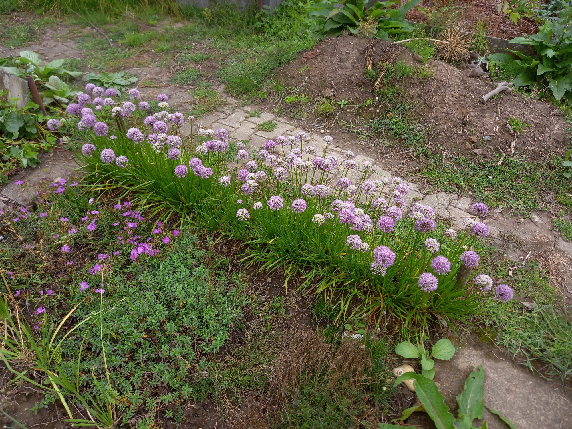 Hier blüht auch Allium Millenium zusammen mit noch sehr jungen Stipa tenuissima. Im Hintergrund Sedum Herbstfreude noch knospig.