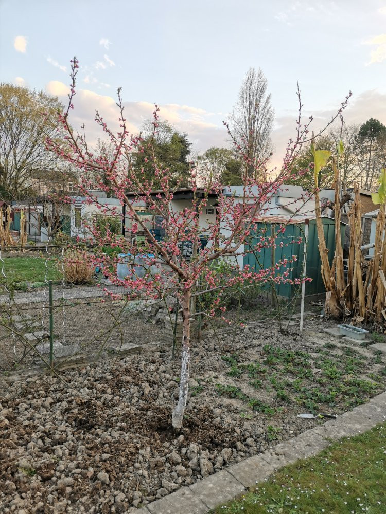 Die Folie soll die vom Haus (trotz Wärmedämmung) abgestrahlte Wärme reflektieren. Und so Passionsfrucht Pflanzen, Erdbeerguaven und die Poncirus schützen. Die direkt an der Hausmauer gesetzte Feige bekam einen alten Küchen-Schneekessel verpasst, der gleichzeitig als Igelhaus dient.