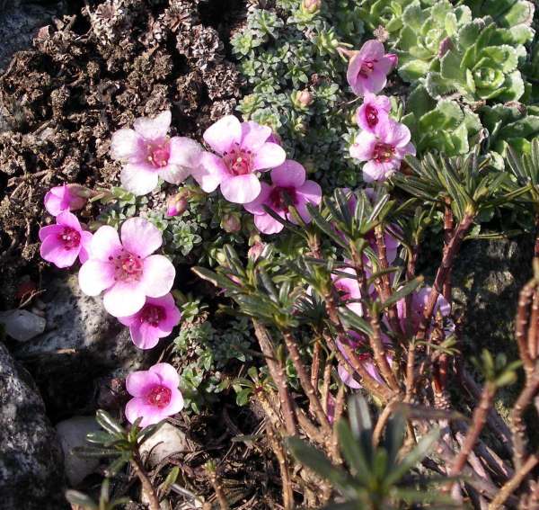 Und hier, ebenfalls unter dem Erker: Saxifraga dinnikii.Es gibt sie wohl in unterschiedlichen Farbtönen.