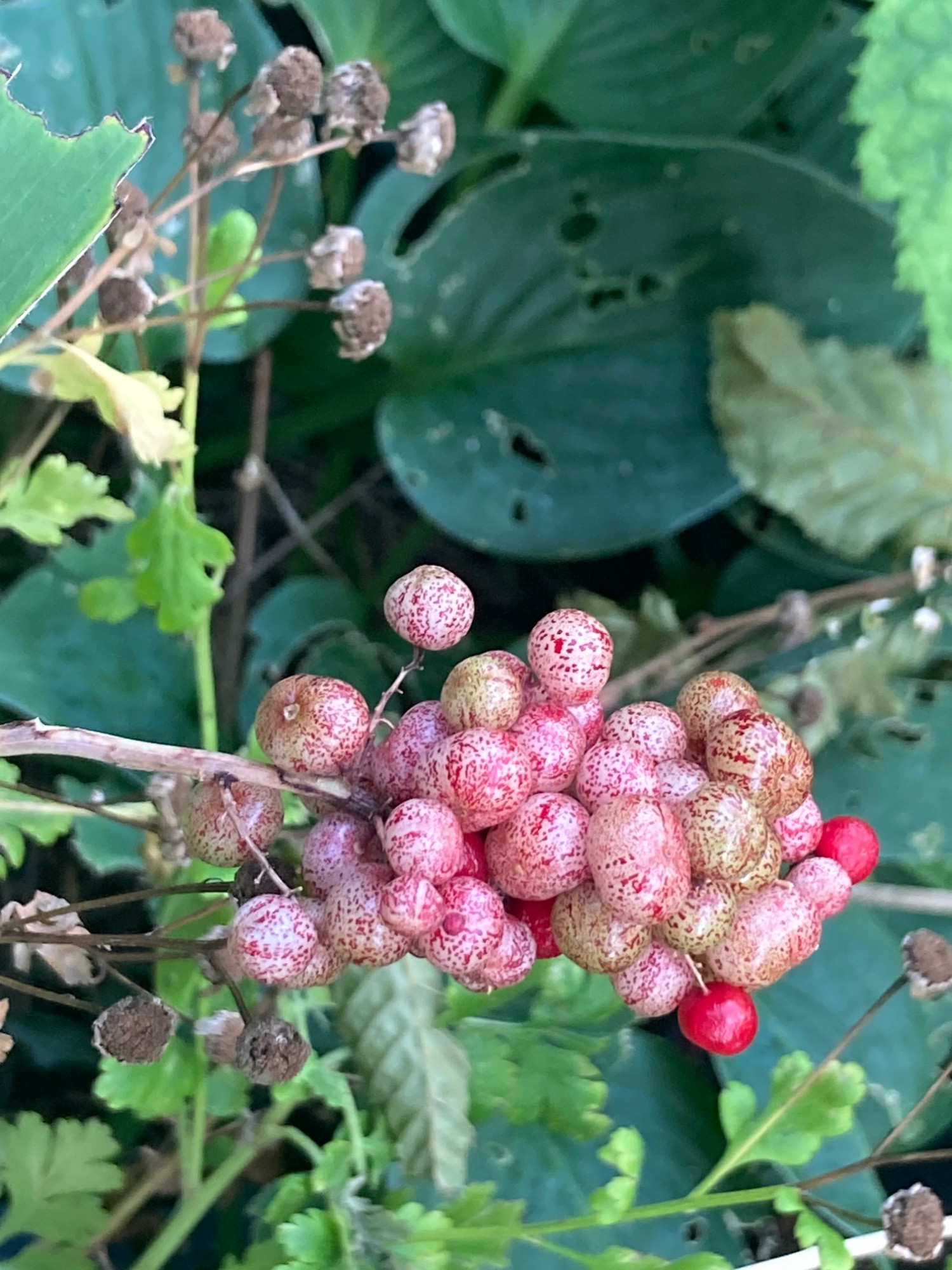 Sesamum trilobum (?) passt zu den strengen Körperausdünstungen derzeit und Maianthemum racemosum blüht zwar nicht, aber hat doch recht auffallenden Fruchtbehang.