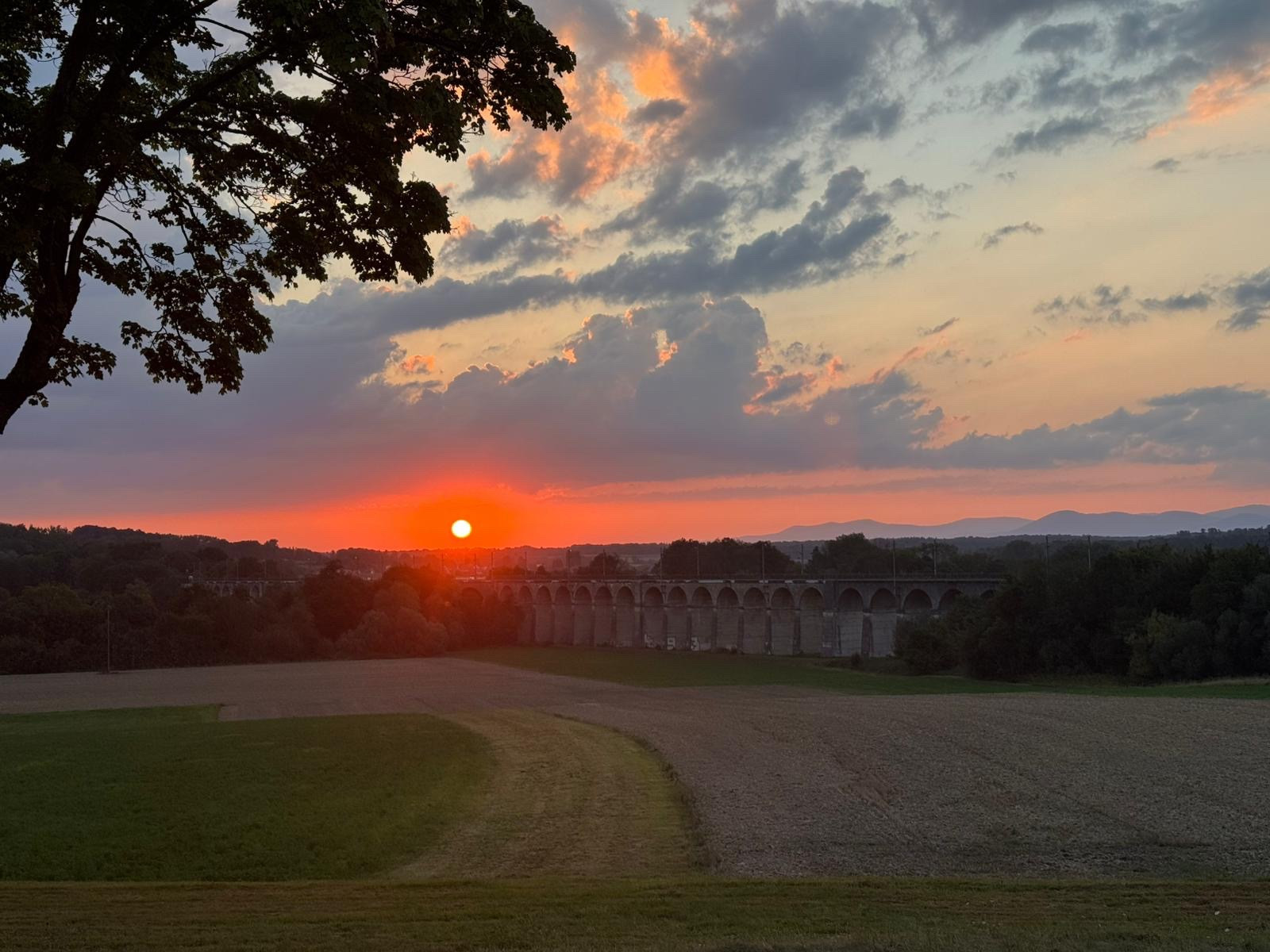 Sonnenuntergang trifft Eisenbahnviadukt. (Mann hat fotografiert.)