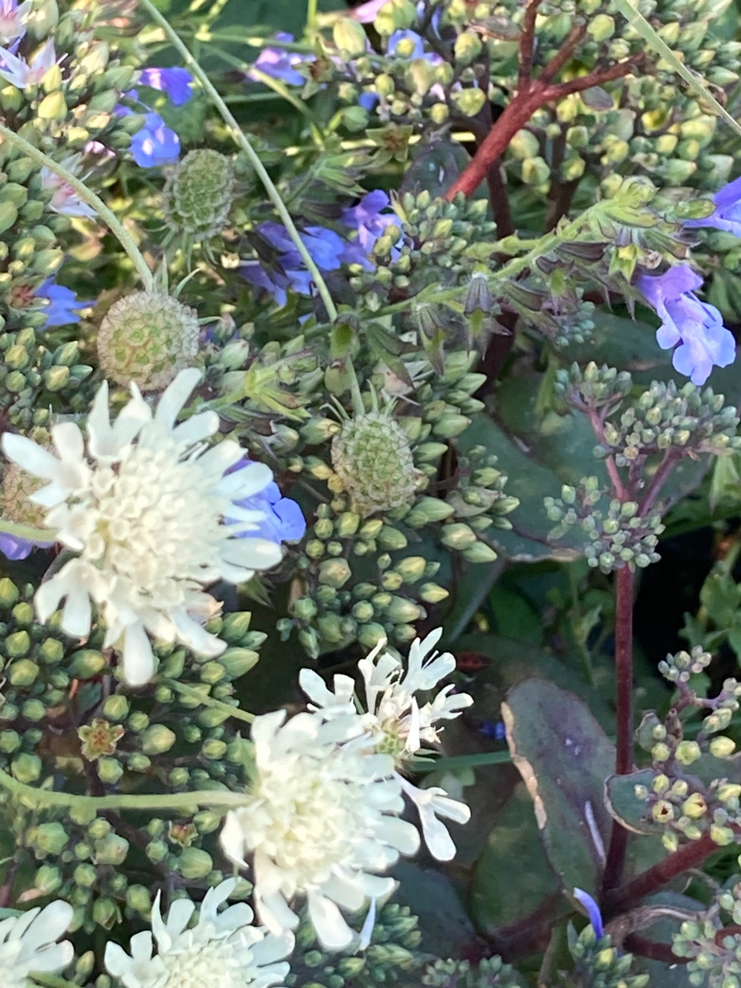 Thalictrum Lucidum blüht tatsächlich auch noch ist aber so klein das ich es erst übersehen habe. Also auch schon Monate am blühen. Der Teufelsabiss als Solitär erinnert an Allium