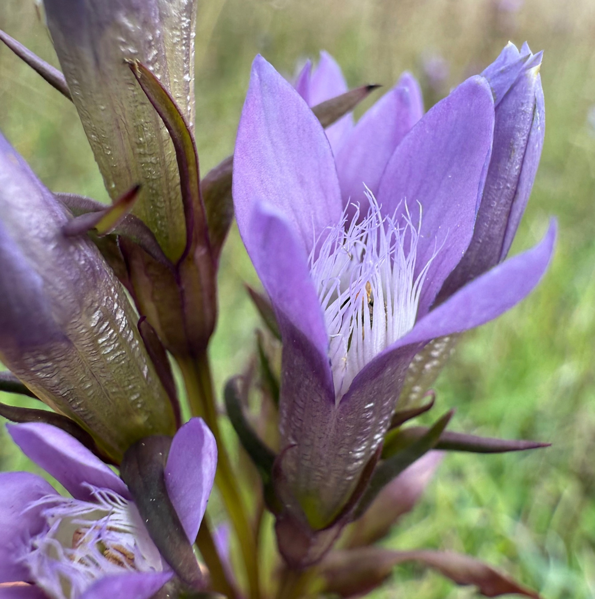 Ein weiter Enzian Gentianella ciliata der Fransen-Enzian ist zwar kleiner als der deutsche Fransen-Enzian ( Im Hintergrund noch zu sehen) ist aber aufgrund seines iridisierenden Blau seiner Blüte kaum zu übersehen: