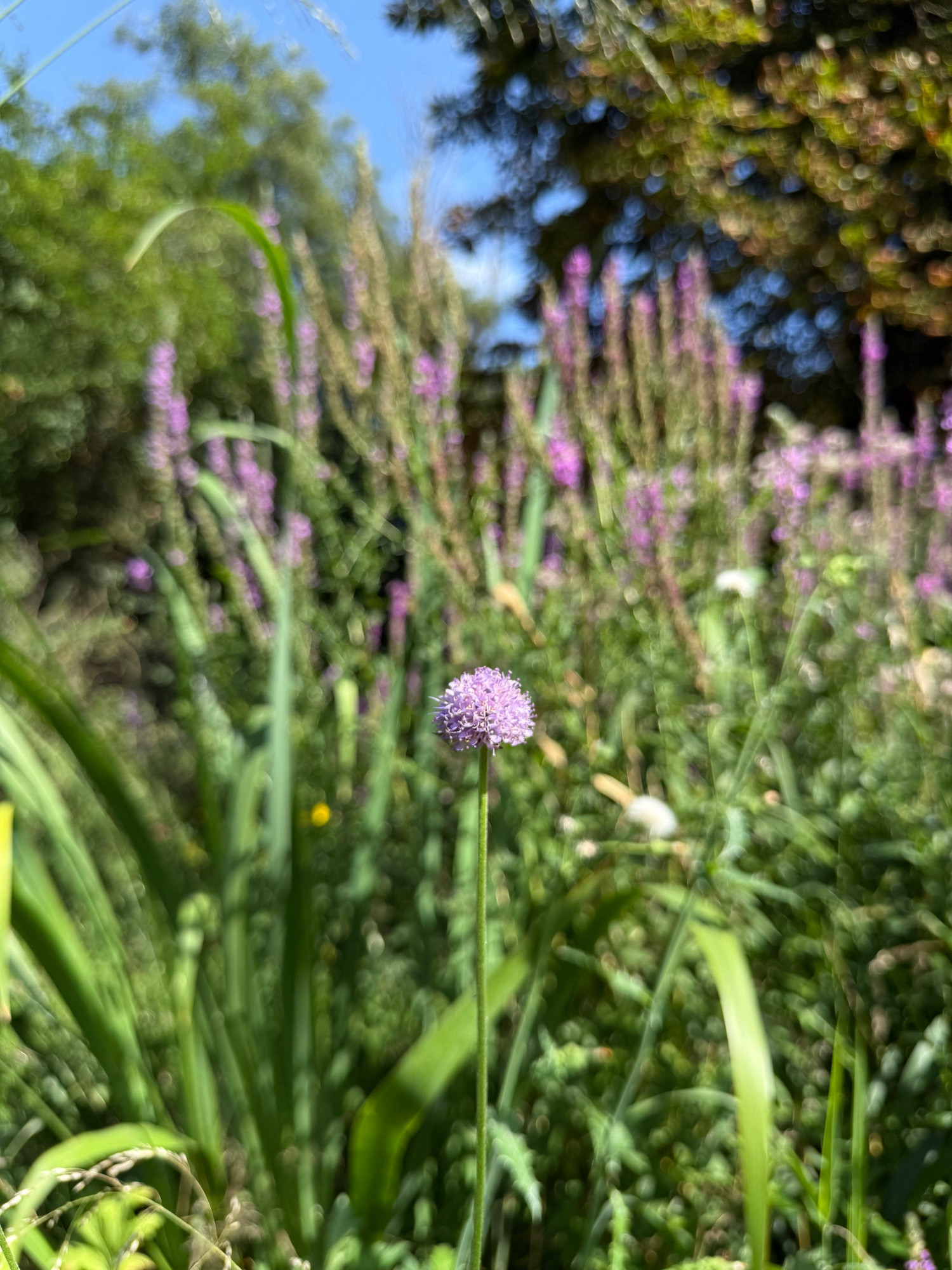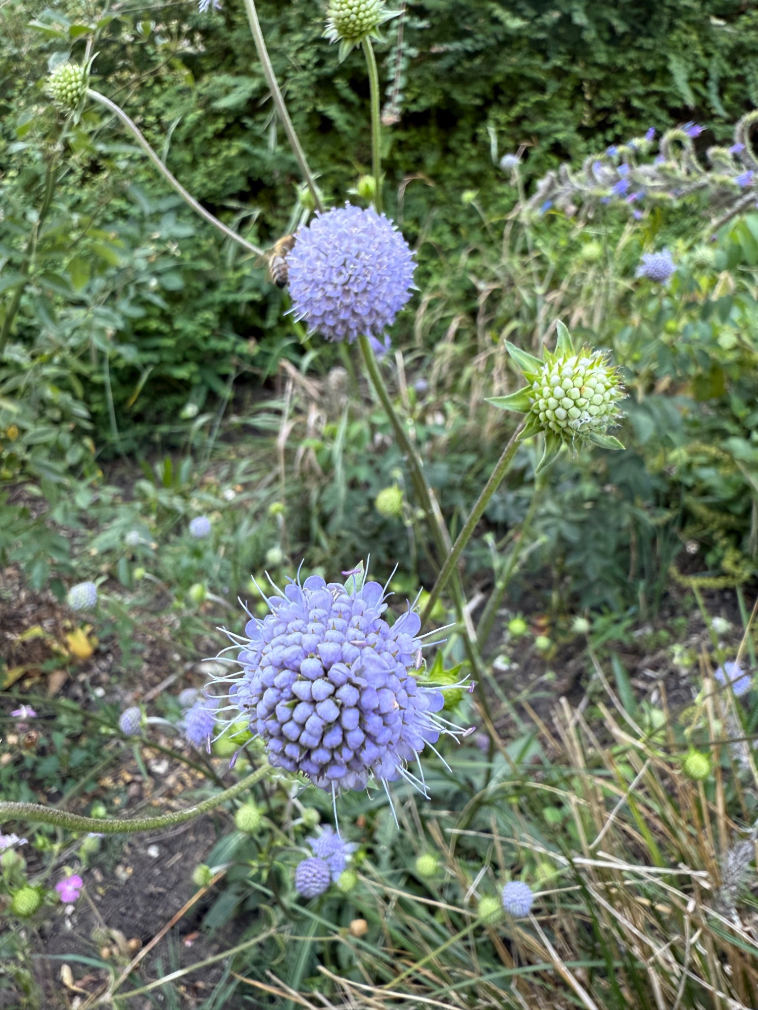 Thalictrum Lucidum blüht tatsächlich auch noch ist aber so klein das ich es erst übersehen habe. Also auch schon Monate am blühen. Der Teufelsabiss als Solitär erinnert an Allium