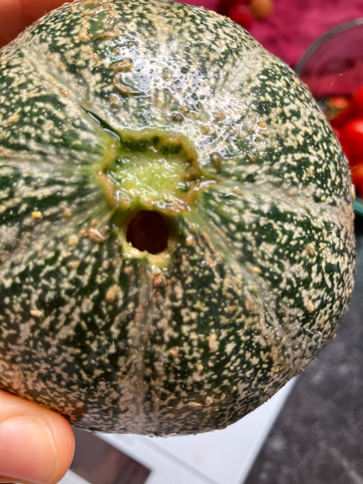 An den Charentais sind mir kreisrunde Löcher aufgefallen (s. Bild). Was könnte das sein? Die Früchte hängen alle mindestens 10cm oberhalb des Bodens, sind also für etliche Krabbel- und Kriechtiere schwer erreichbar....