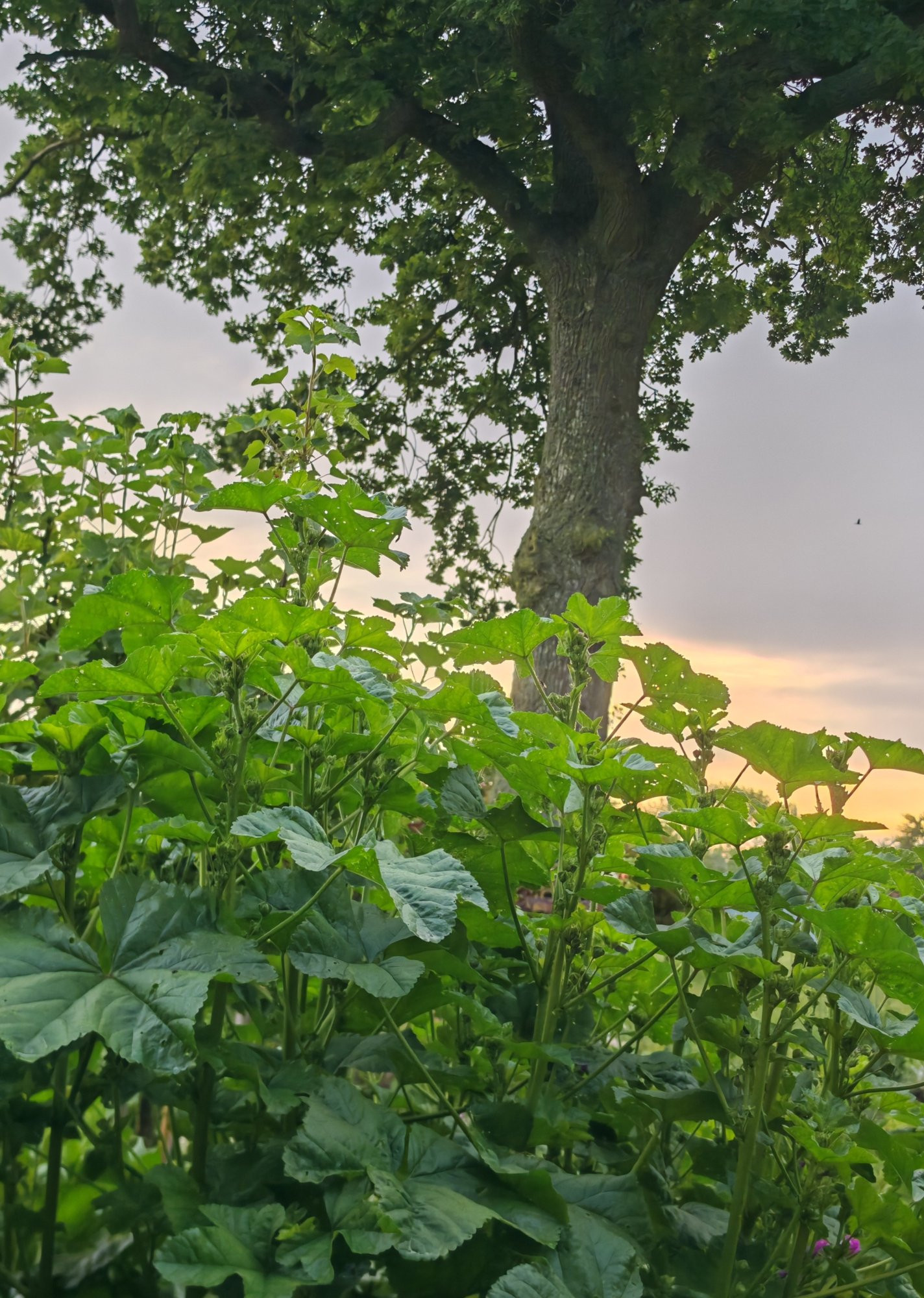 Bald erreicht die irre "Baum-" (?) Malve aus der Saattüte (leider futsch) die alte Hofeiche