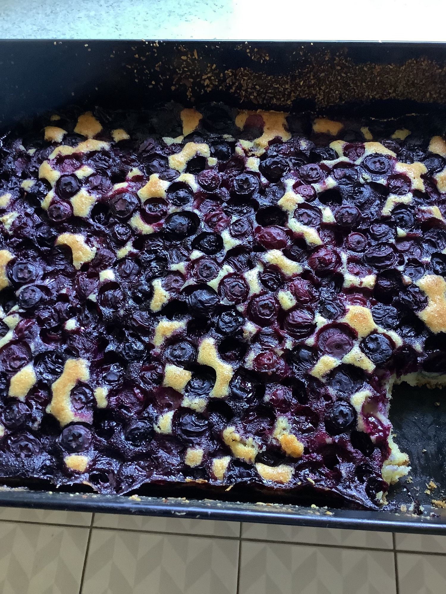 Jetzt gab es Johannisbeeren und ich hatte keine Lust auf das Baiser-Zeugs. Also musste der Apfel-Weinkuchen "geringgradig" modifiziert werden, damit er mit Johannisbeeren funktioniert.