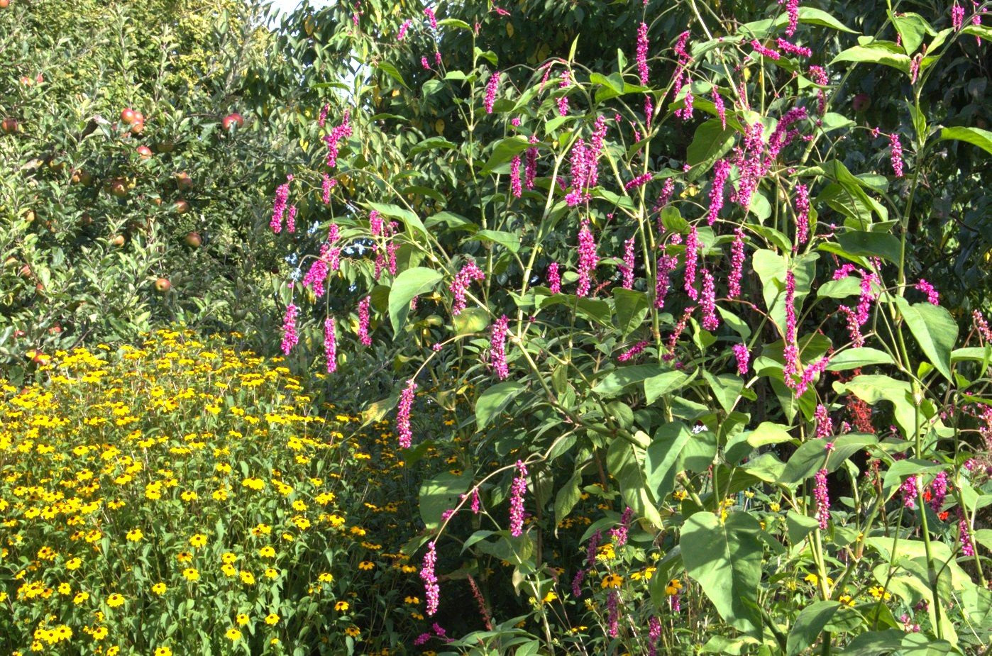 Hier blüht Polygonum orientale, Leonotis nepetifolia und Heliopsis "Bleeding Hearts"