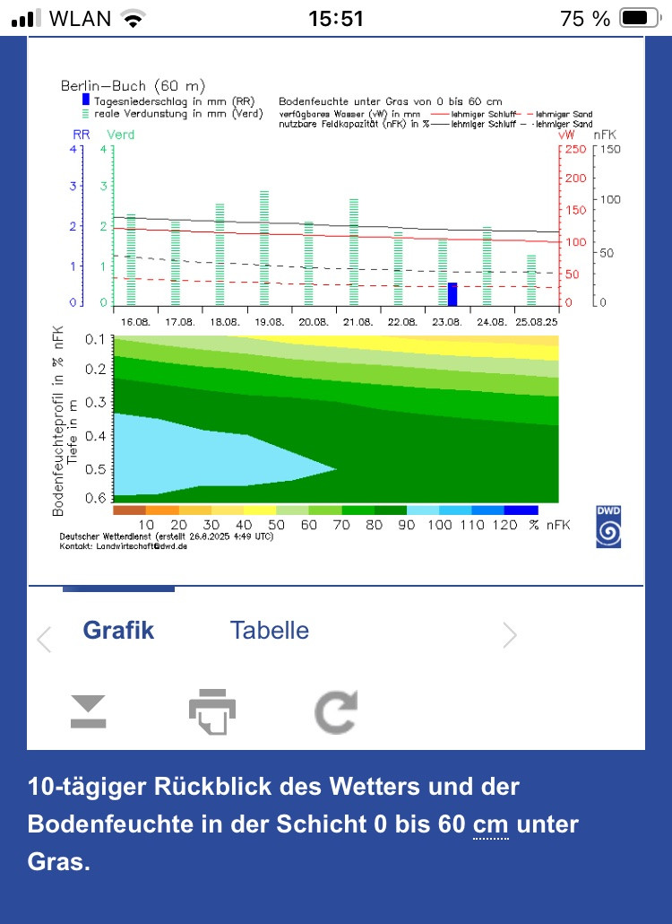 Schau mer mal. Für heute ist der vorhergesagte Niederschlag, der gestern plötzlich auftauchte, wieder weg. Morgen stehen immer noch 10 mm drinnen. Ich glaubs erst, wenn sie gefallen sind
