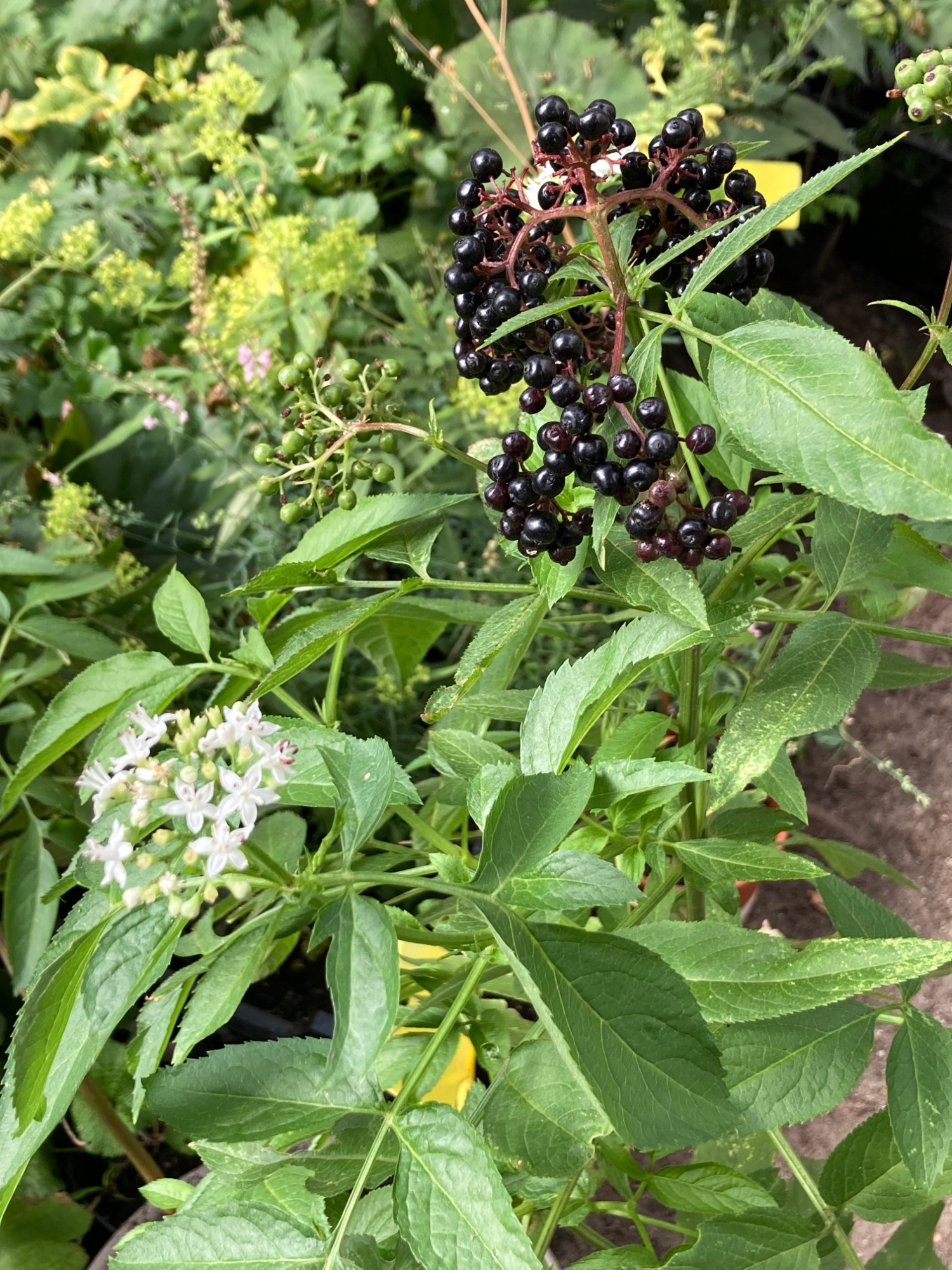 Chelone obliqua, Dauerblüher Clematis integrifolia und blühfruchtend Sambucus ebulus