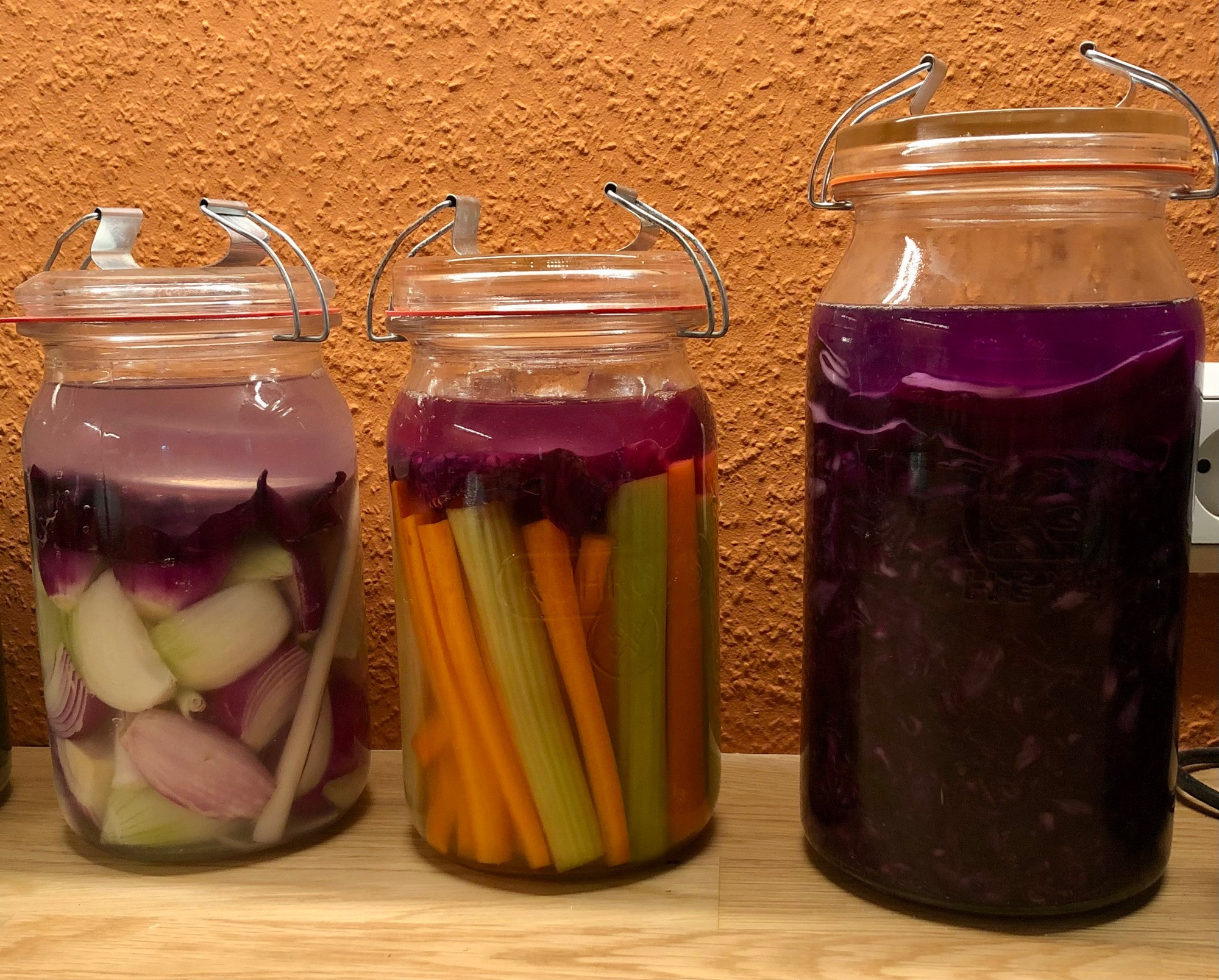 Ich habe auch wieder mit der Fermentation angefangen. Vor Wochen Sauerkraut in Salzlake, kam als Geschenk super an und schmeckt toll. Im Keller steht noch ein vier L Glas. Ich nutze Einmachgläser um den Prozess der Fermentation im Auge zu behalten. Heute habe ich erstmal Glasgewichte bestellt, mein Mann wird mir passende aus Eichenholz herstellen.