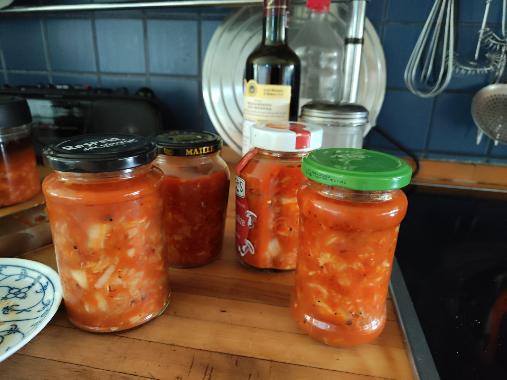 Leider wurde Sohn, für den das Kimchi gedacht ist, krank. Jetzt steht das gute Zeug im Kühlschrank - schön scharf!