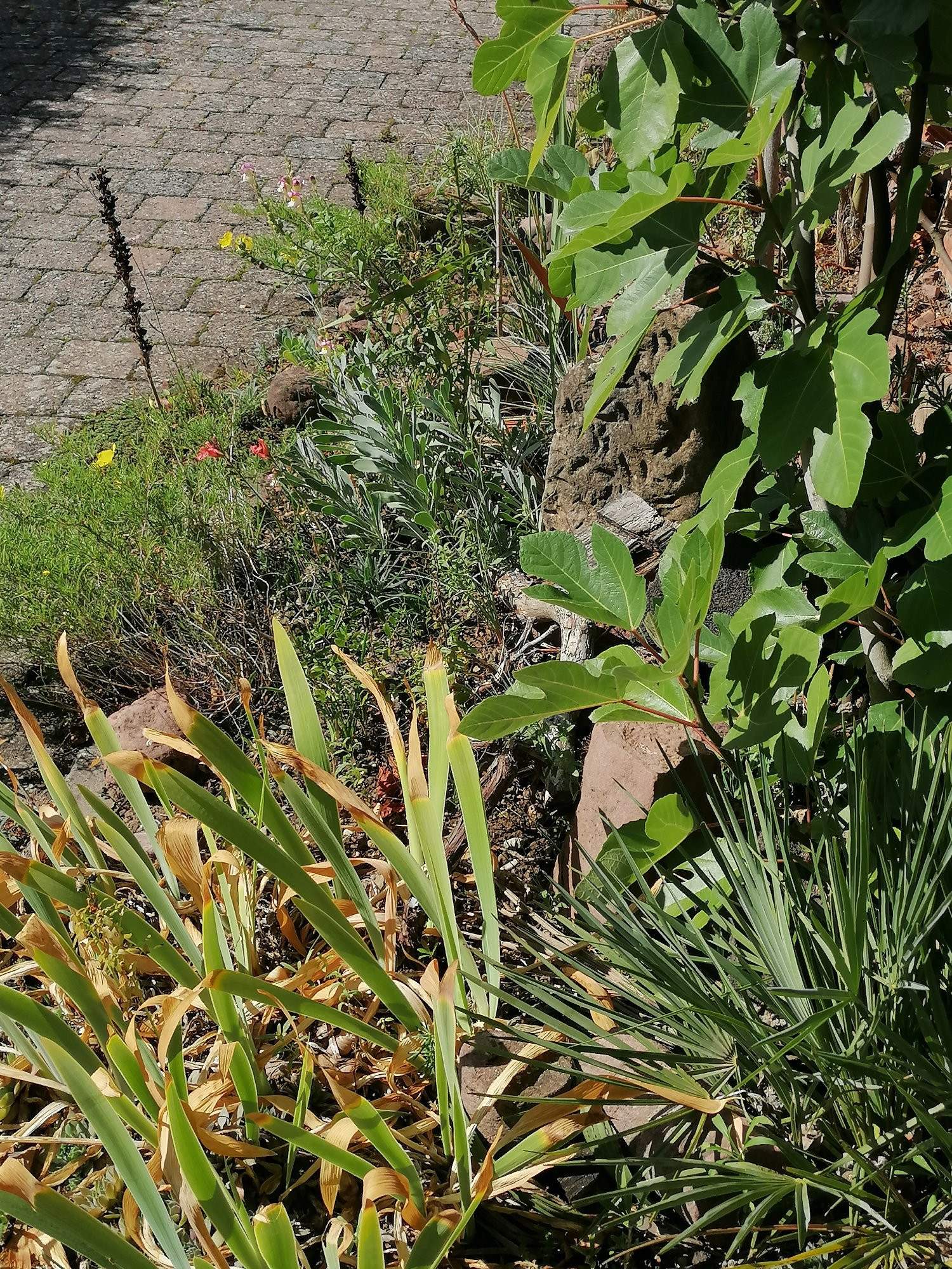 Chamaerops cerifera, Iris imbricata, Calylophus, Antirrhinum (latifolium) und Othonna