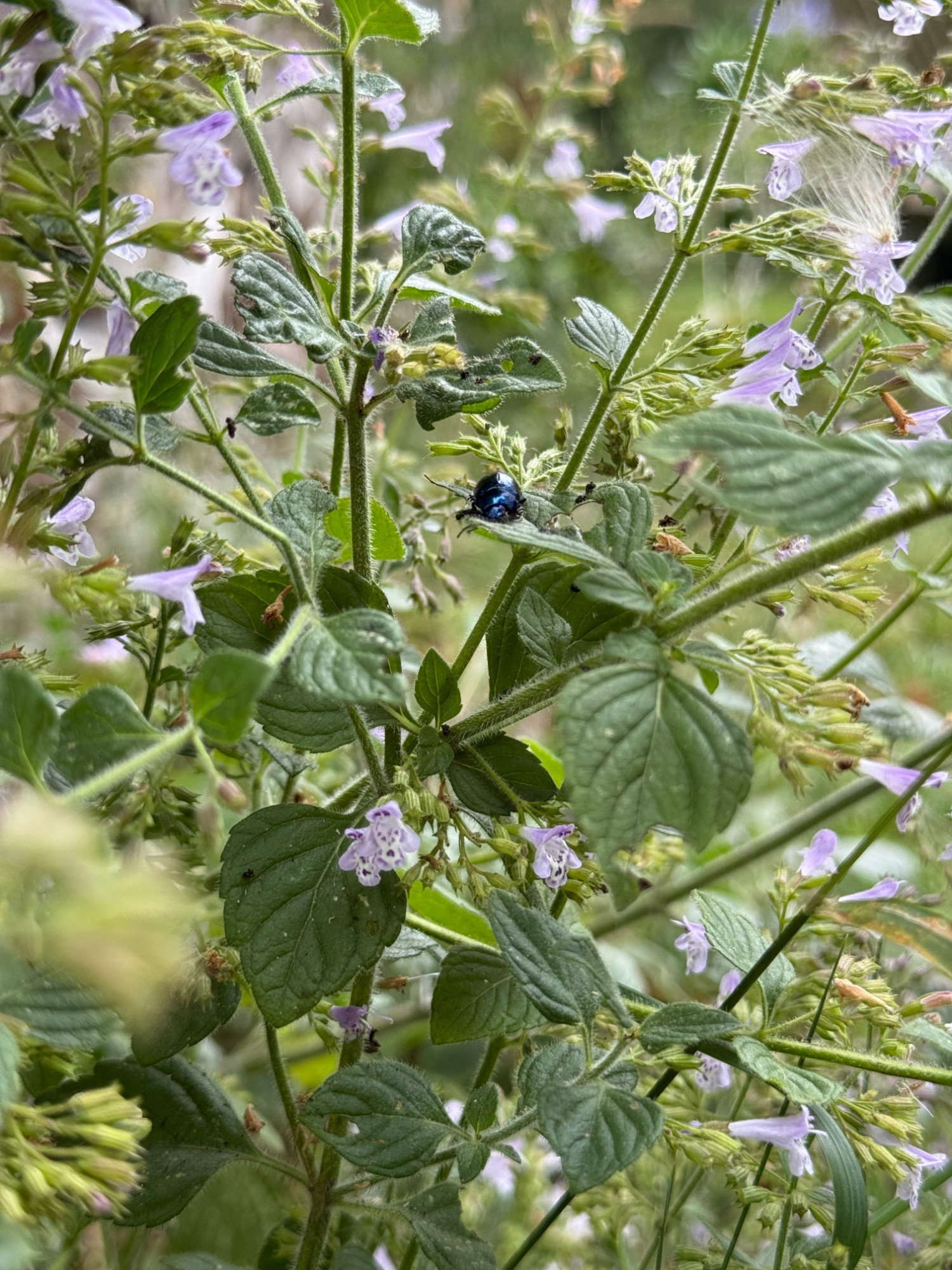 Der Himmelblaue Minzblattkäfer (Chrysolina coerulans) ist ein auffälliger Käfer aus der Familie der Blattkäfer. Hier labt er sich an den Blättern von der Bergminze, an Mentha Arten im Garten habe ihn noch nicht entdeckt