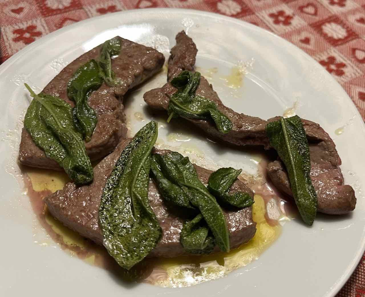 Hauptgerichte Kalbsleber mit Salbeibutter gebraten sowie Basmatireis mit "Reisparfüm" und Butter gedämpft und mit Curcuma bestreut zur Cuvée Shiraz/Mouvèdre/Grenache 2016 "Angel's Drop" aus Swartland, Südafrika.