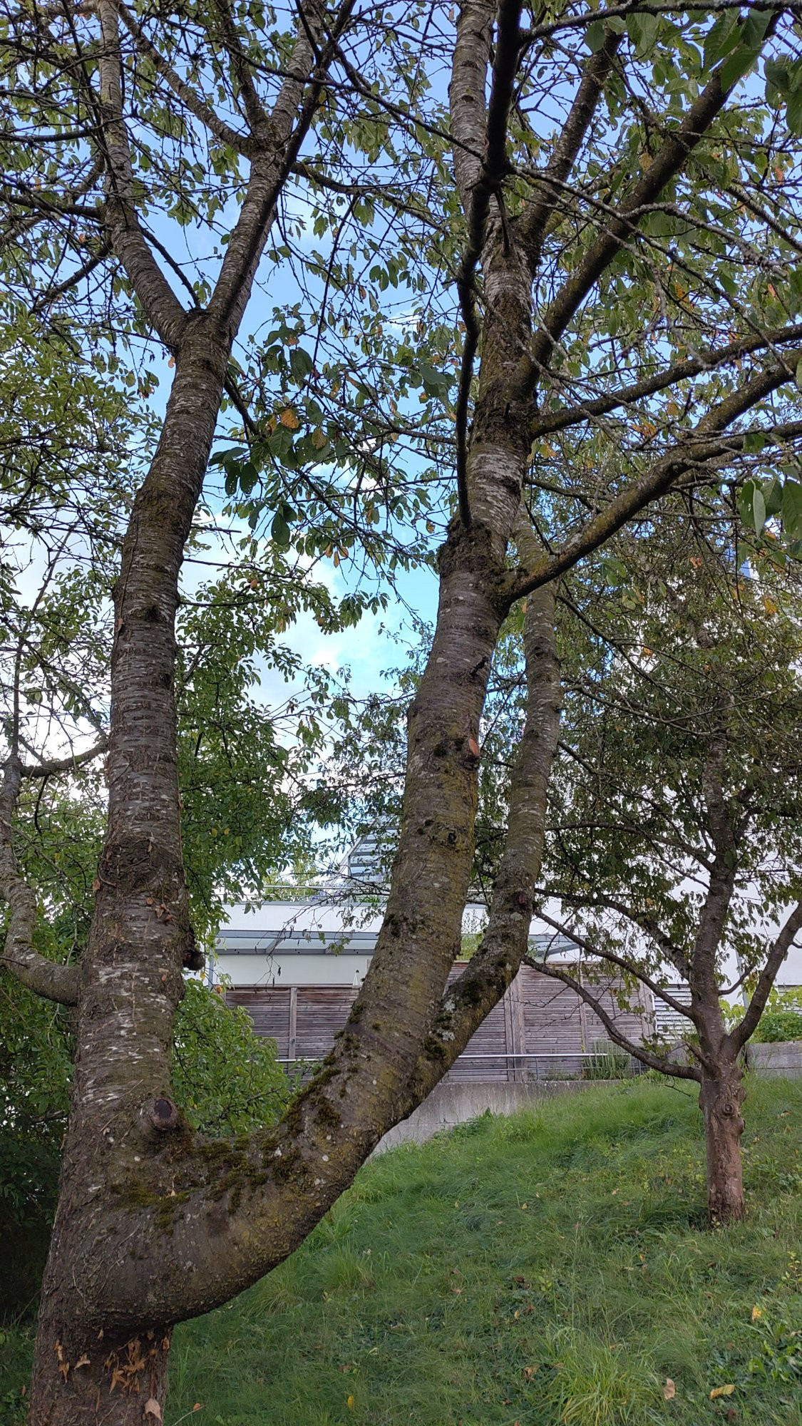 Man kanns auch lassen. Der Rest drumrum ist halt verschattet durch die Kirsche und die Kirsche selbst ist bereits im Verkahlungsmodus. So wie sie aussieht, würde sie ein Rückschnitt, der den anderen Bäumen wieder Licht gibt, sie so beschädigen, dass sie in ein paar Jahren instabil wird und abstirbt. Die Äste sind bis weit oben viel zu stark. Das gibt bei Schnitt Nekrosen, die den Ast herunterlaufen. Ob die Kirsche eine Sorte oder eine durchgetriebe Unterlage ist, spielt dabei keine Rolle.