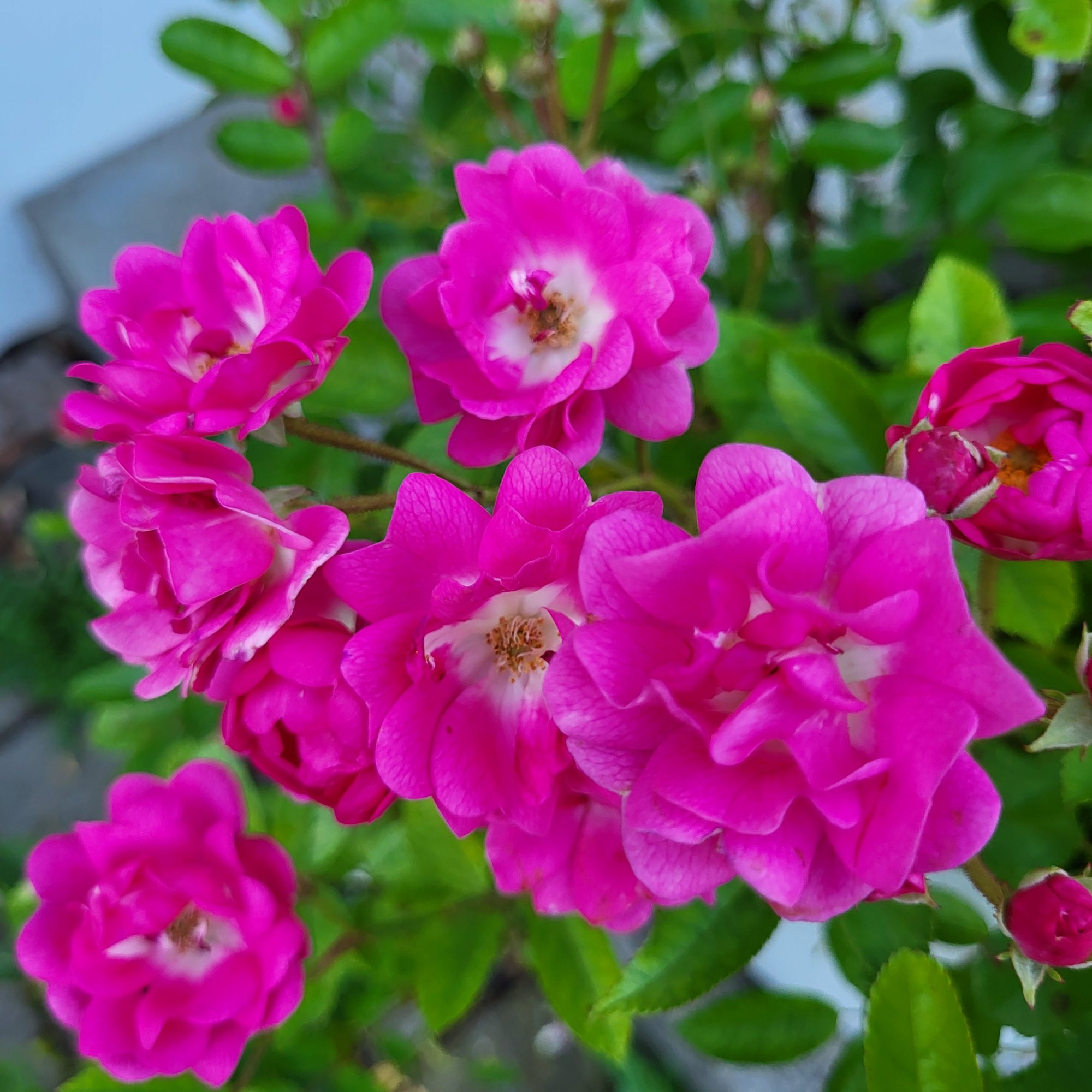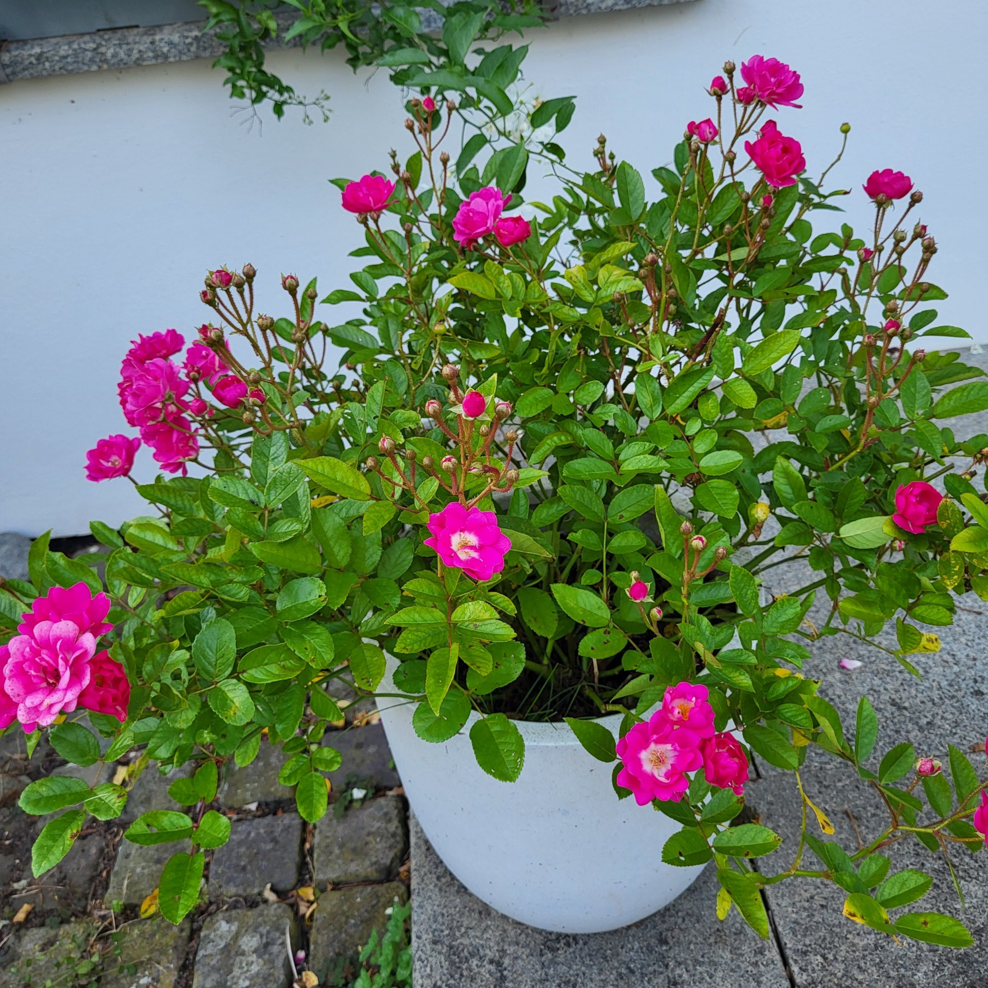Rotraut steht im 1. Jahr und geht jetzt in die 2. Runde. Ave Maria, diese auch als Polyantha eingeordnete Rose von Böhm steht eher im Lambertiana-Typ.Größenmäßig passt sie zumindest hier allerdings .Sie beginnt auch mit einem üppigen 2.Durchgang.
