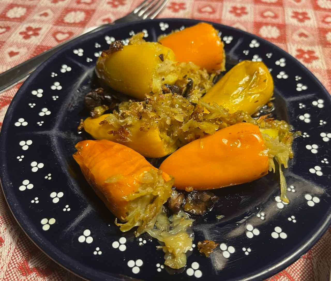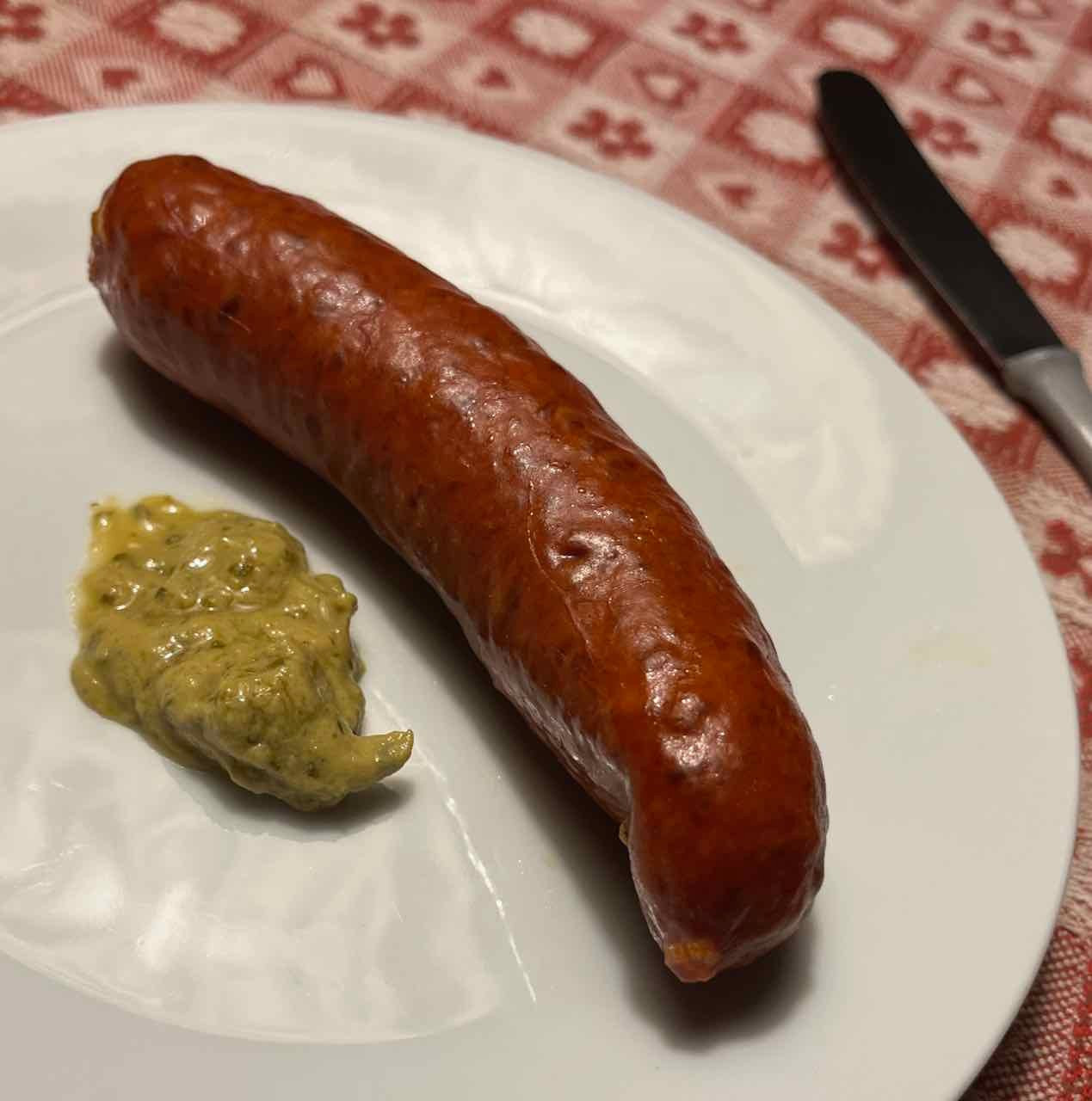 Paprika-Kolbasz gesotten aus Szeged mit Basilikumsenf sowie Mini-Paprika, gefüllt mit Soja-Schnetzel, Champignons, Frühlingszwiebeln und geriebenen Drillingskartoffeln zur Giesinger "Freiheit"