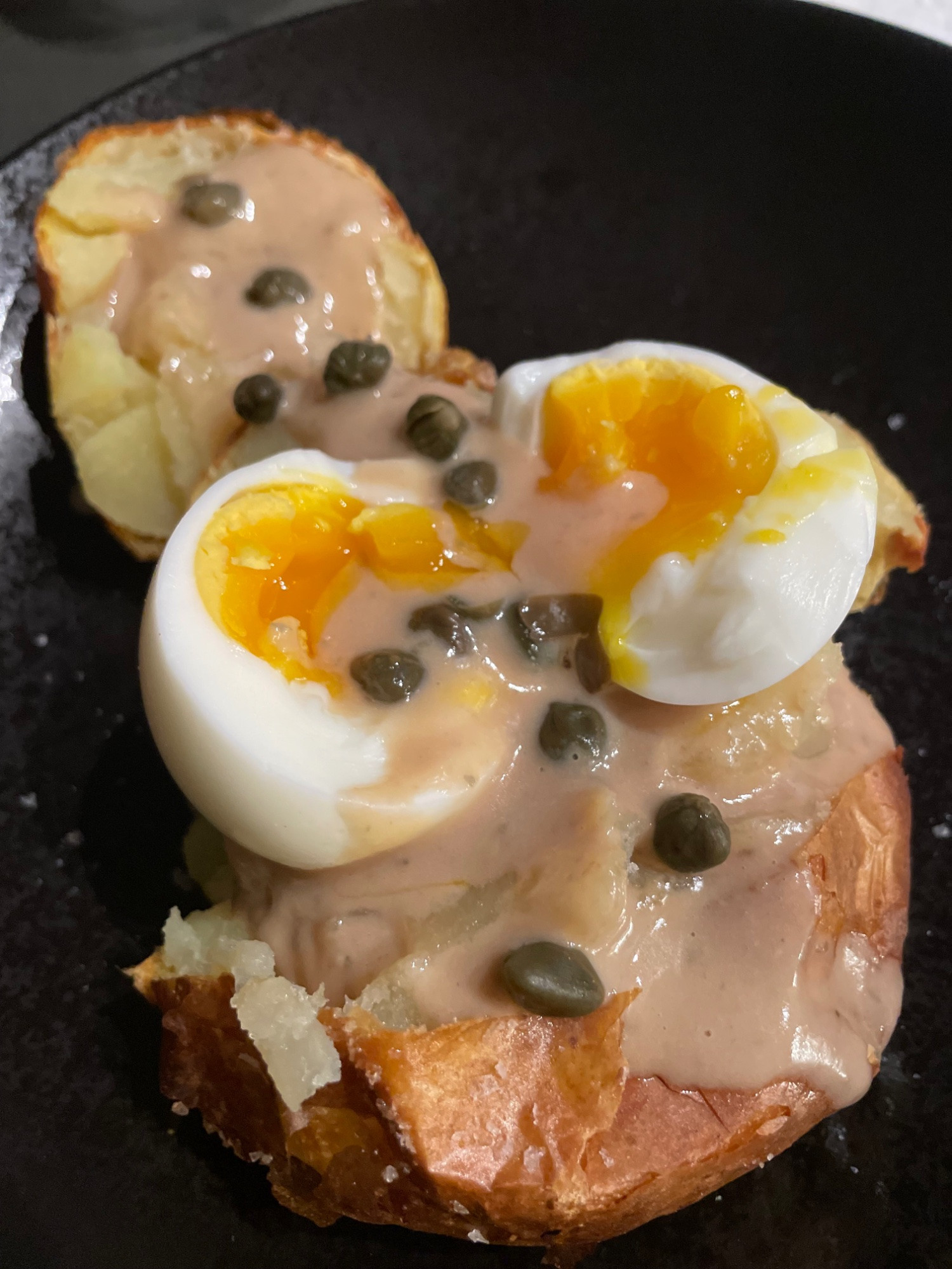 Bei uns gab es Ofenkartoffel mit Ei und Thunfischsauce.