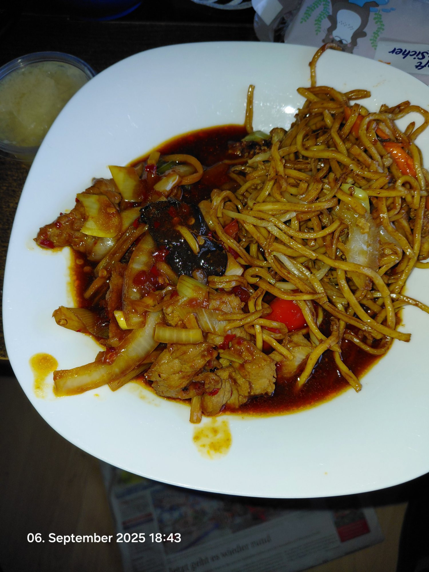 Es gab gestern Rindfleisch Kunden bao mit gebratenen Nudeln von einem neuen lLeferdienst, etwas weiter entfernt.