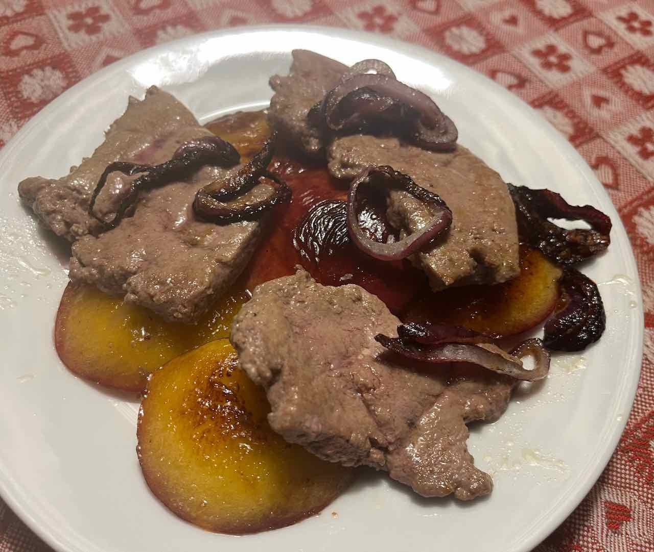 Hauptgerichte Kalbsleber Berliner Art mit Zwiebelringen und Nektarinen gebraten sowie Kartoffelbrei mit Schnittlauch zum Amarone della Valpolicella classico 2019