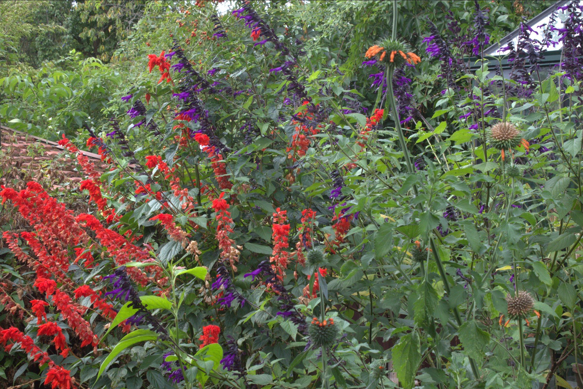 Vor dem Gewächshaus ist es ähnlich, da habe ich auch wieder Canna dazwischengesetzt und die Zantedeschia ist mit ihrem großen Blattschopf noch schön, auch wenn sie abgeblüht ist. Auch Tetrapanax ist gut im Salvien-Dickicht.