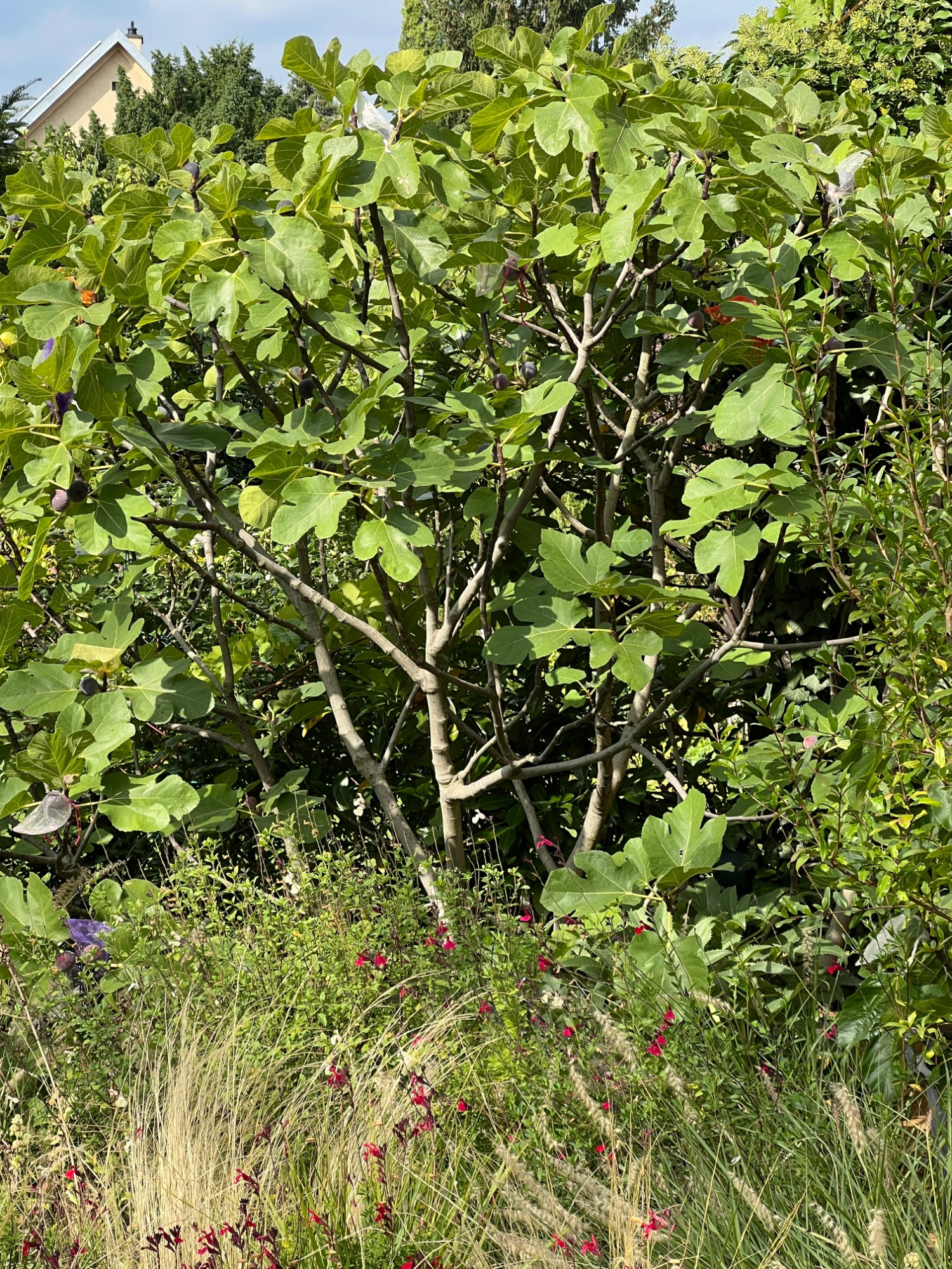 Die Feige ist schwer zu fotografieren, weil so viel rundherum wächst. Maße: < ca. 2,5 Meter hoch (Herbst 2024 etwas zurückgeschnitten) x maximal 3 Meter breit