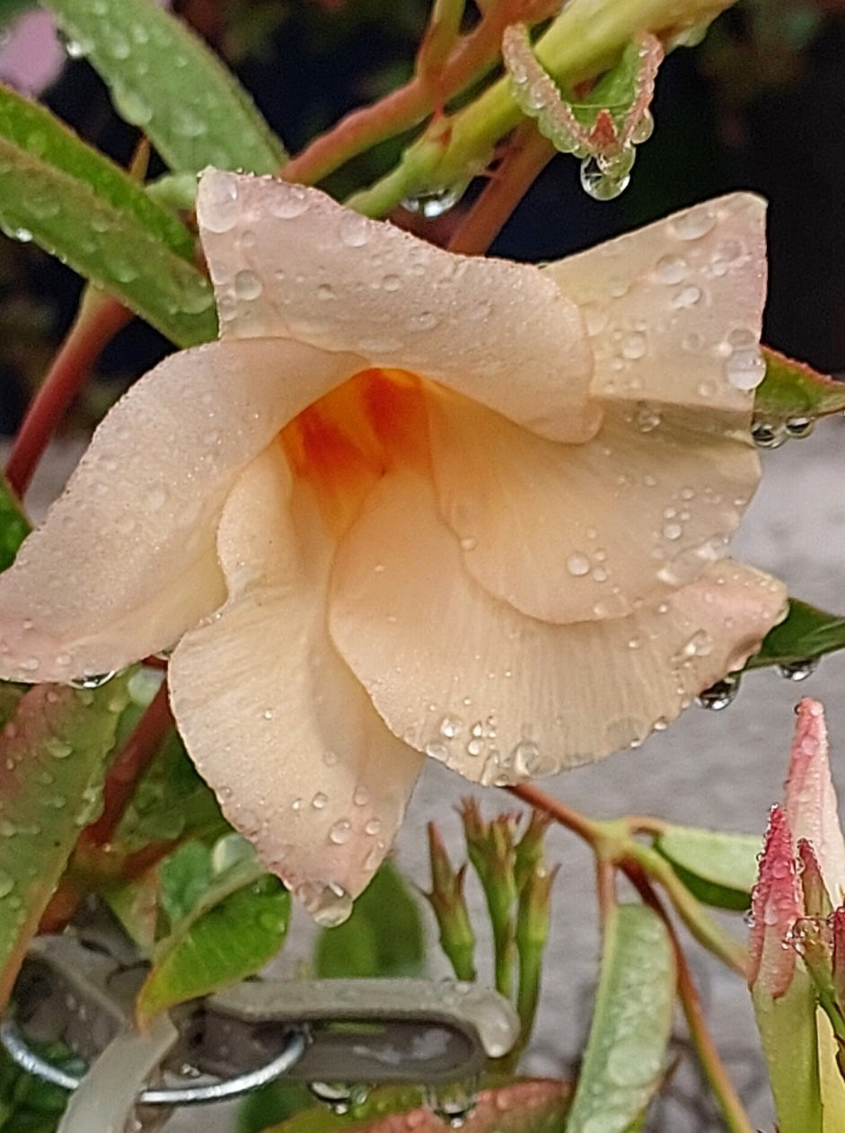 Bei dieser Dipladenia apricot hätte ich schreiben sollen "was blüht erst.....". Diese Pflanze ist für mich jedes Jahr eine Geduldsprobe. Kommt so verhunzt aus dem Winterquartier, dass ich schon mal überlege, sie zu entsorgen. Das hat sie gehört, denn irgendwann, ganz spät im Sommer will sie dann doch und jetzt im September explodiert sie